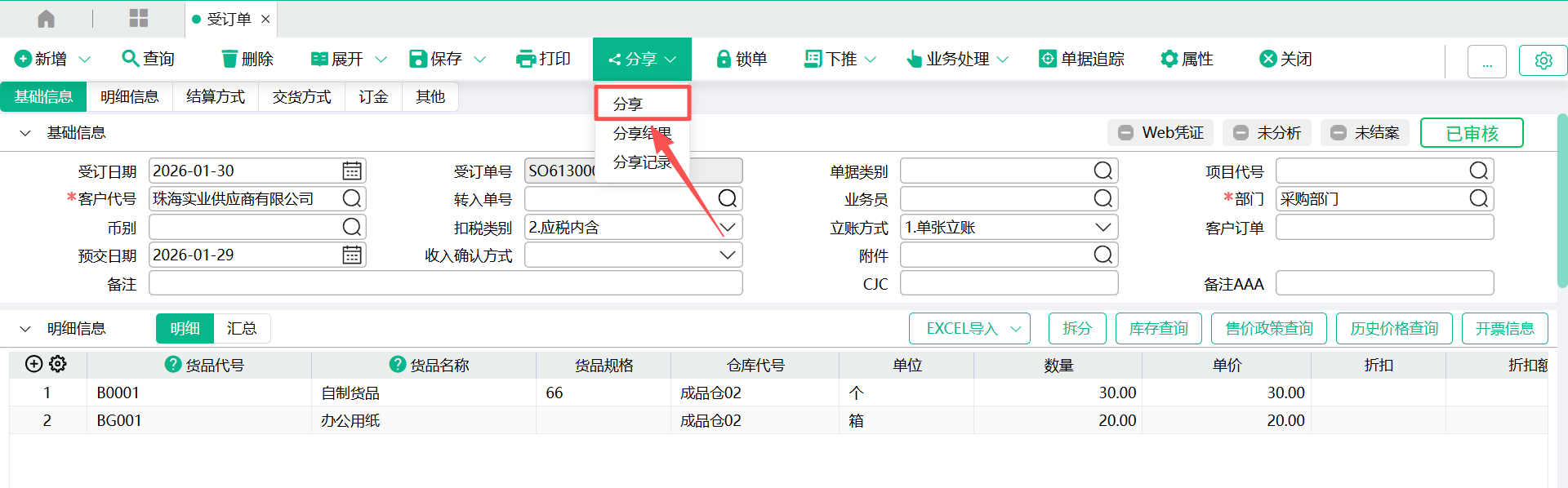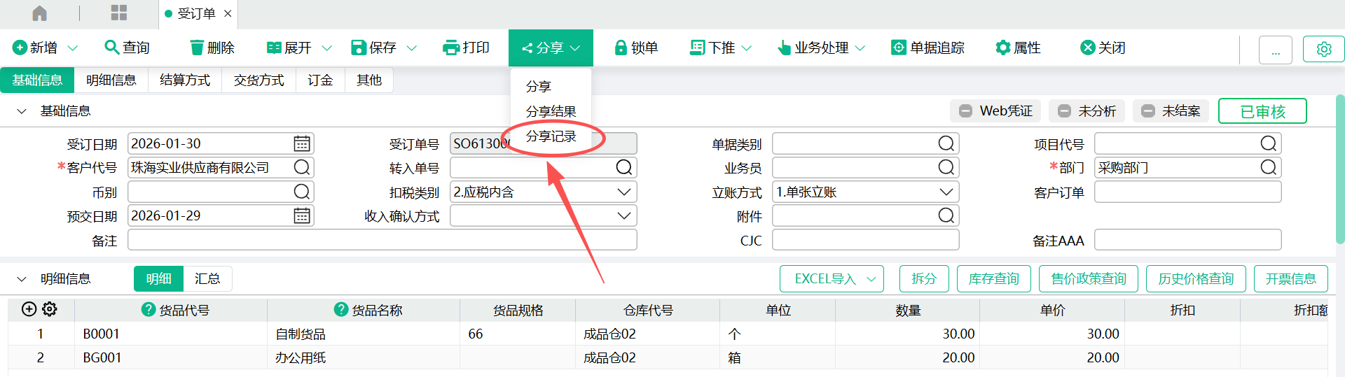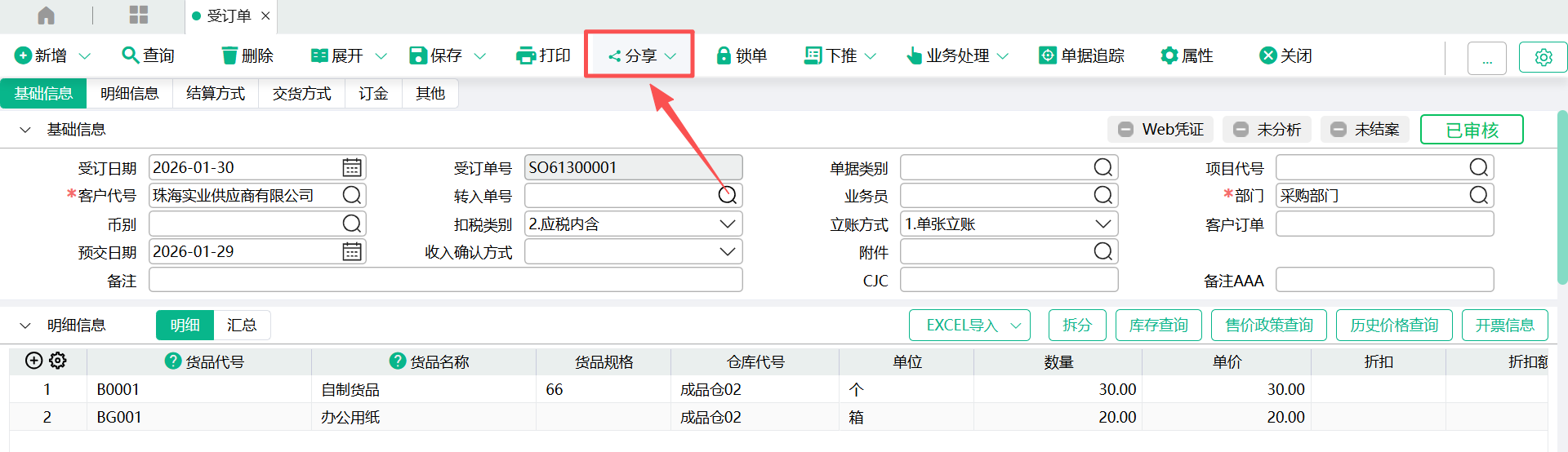 - 单据画面,点击【分享】按钮;下拉菜单,点击“分享”