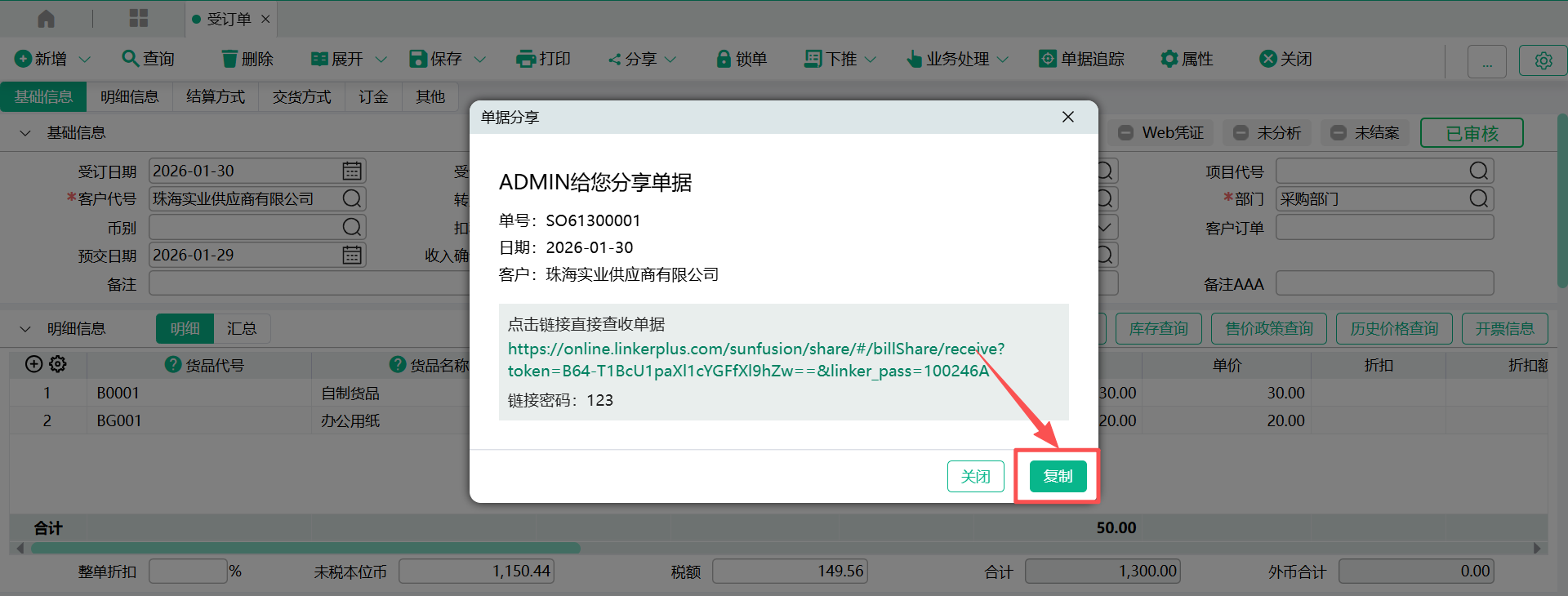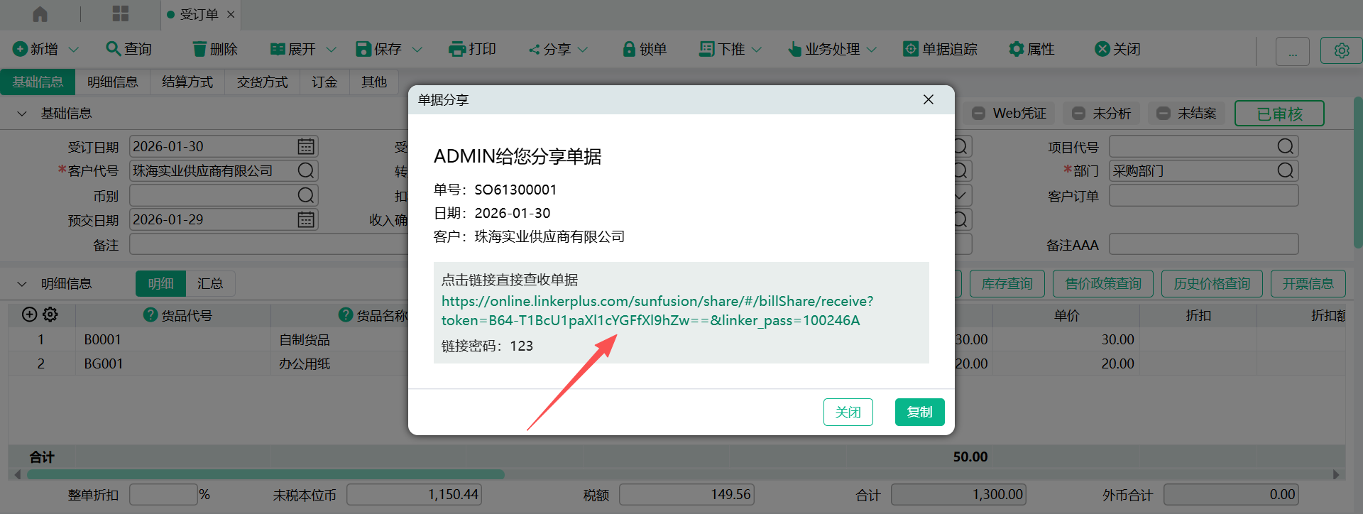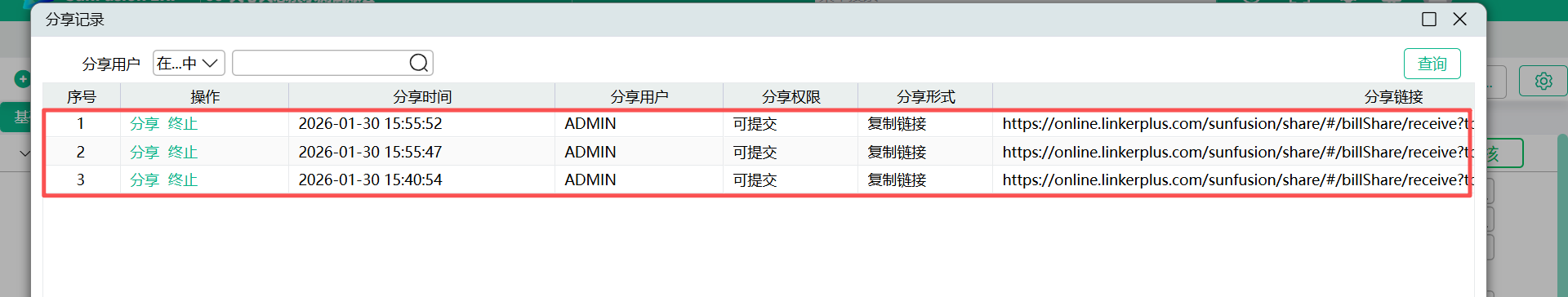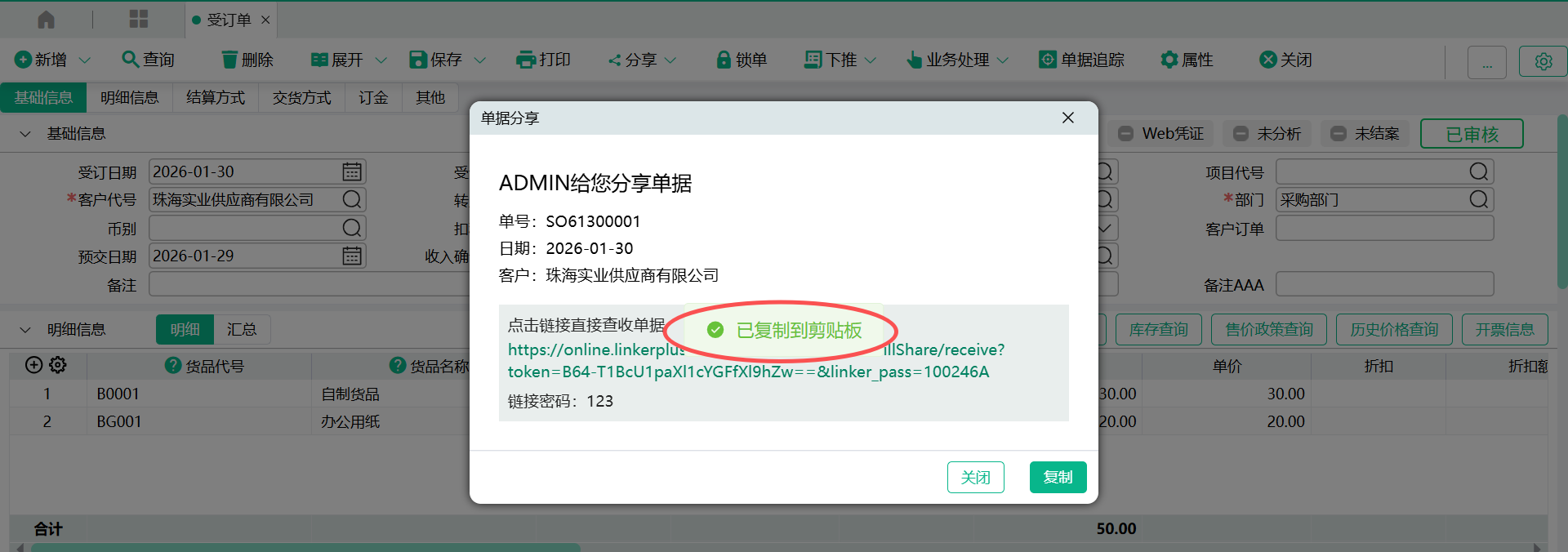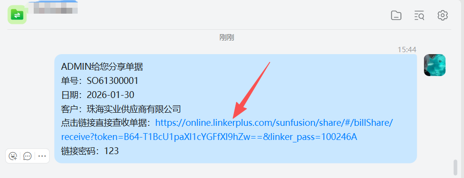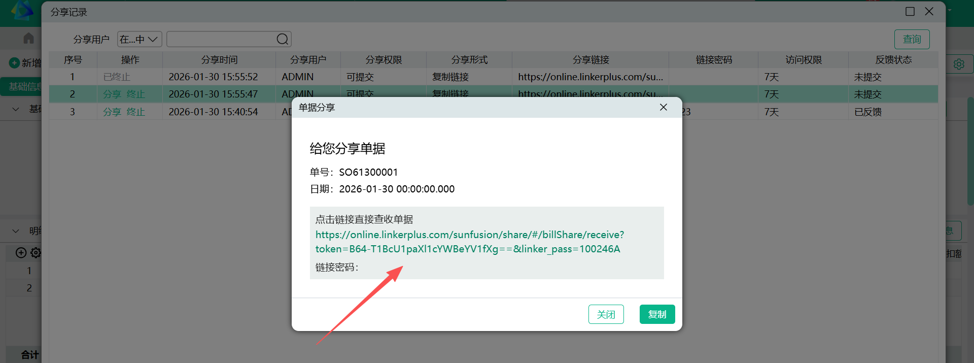 - 确定,弹出分享窗口,窗口会列示分享人、分享日期、单据日期、单据号码、分享链接地址、分享密码