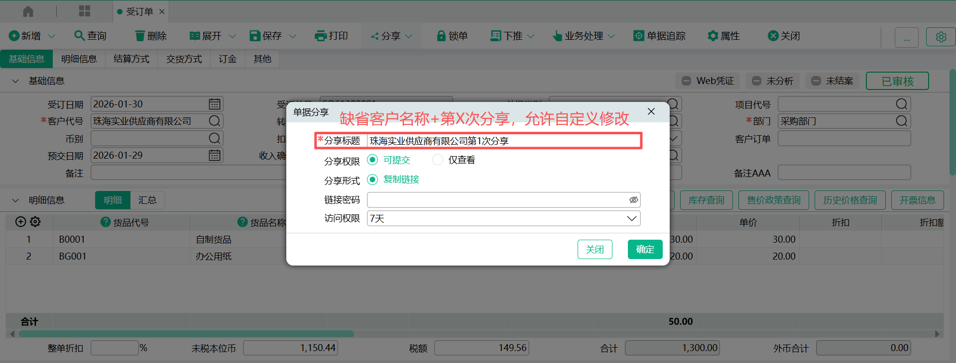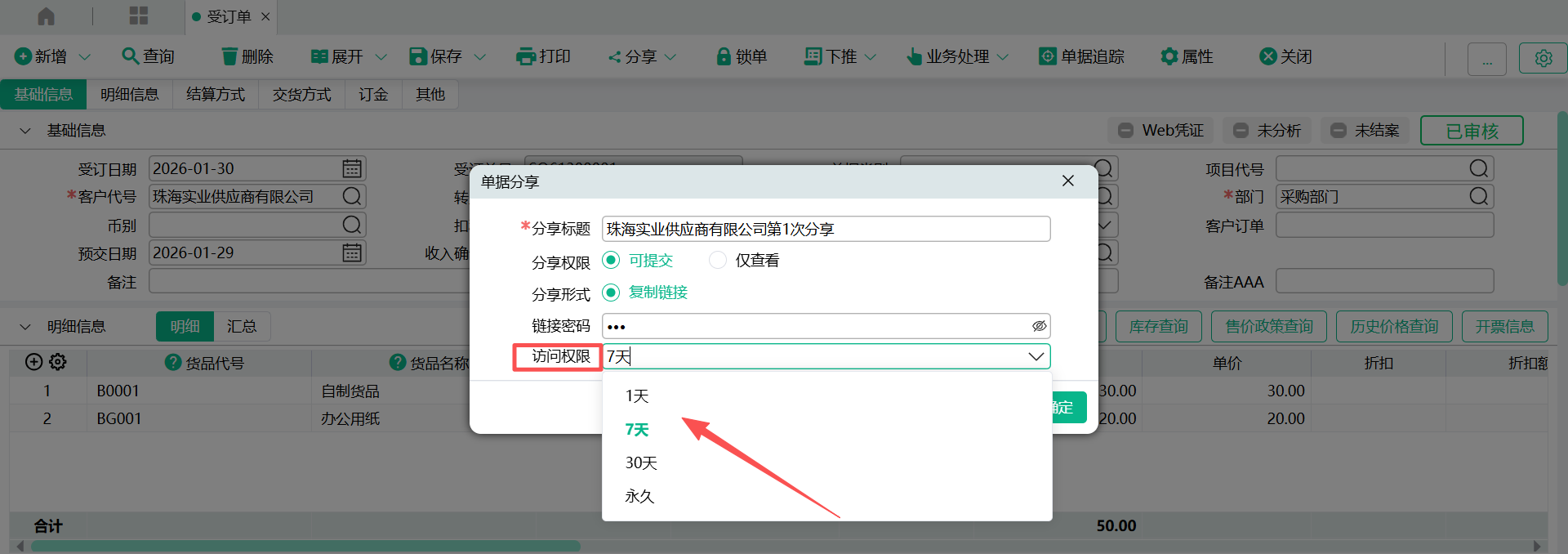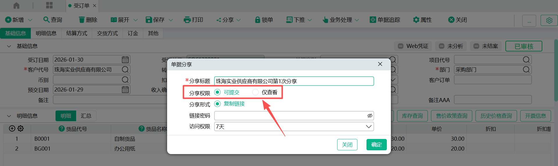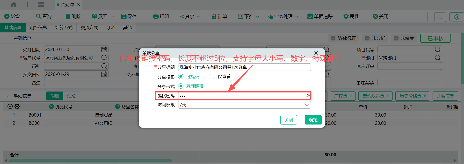 - 确定,弹出分享窗口,窗口会列示分享人、分享日期、单据日期、单据号码、分享链接地址、分享密码