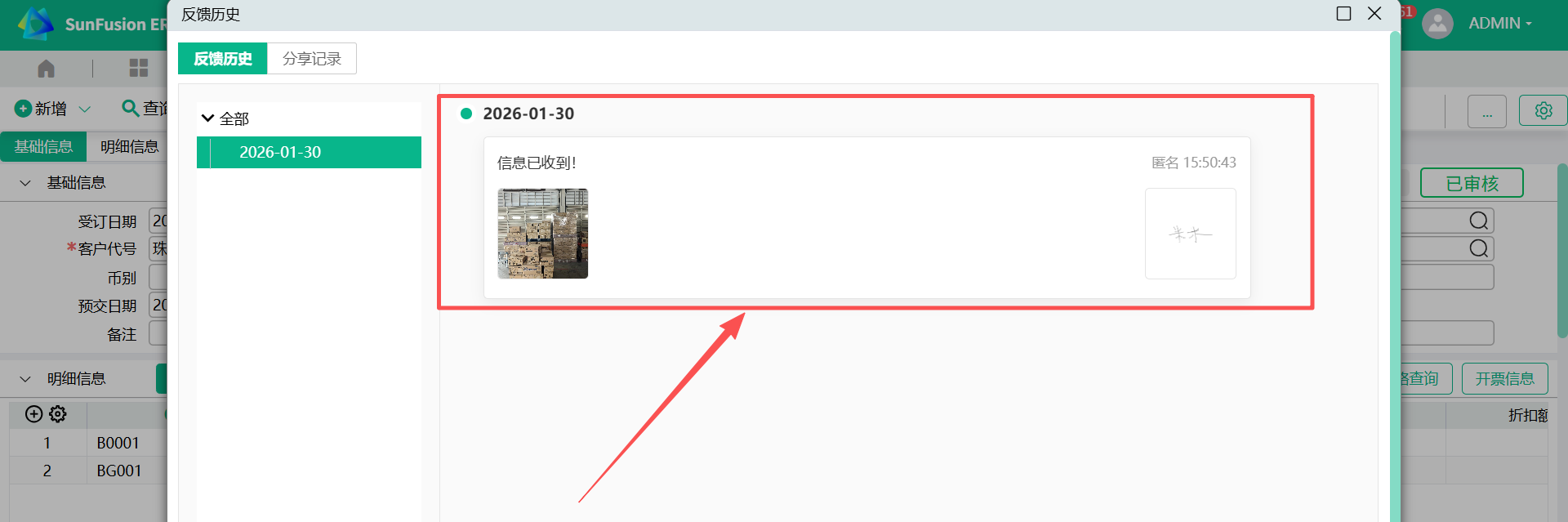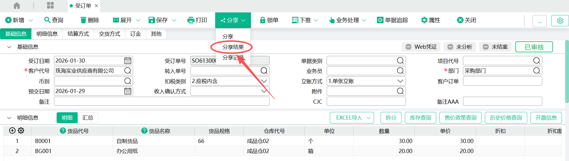 - 分享人查看反馈结果;在来源受订单画面,点击【分享】-分享结果,即可查看到接收人的反馈信息