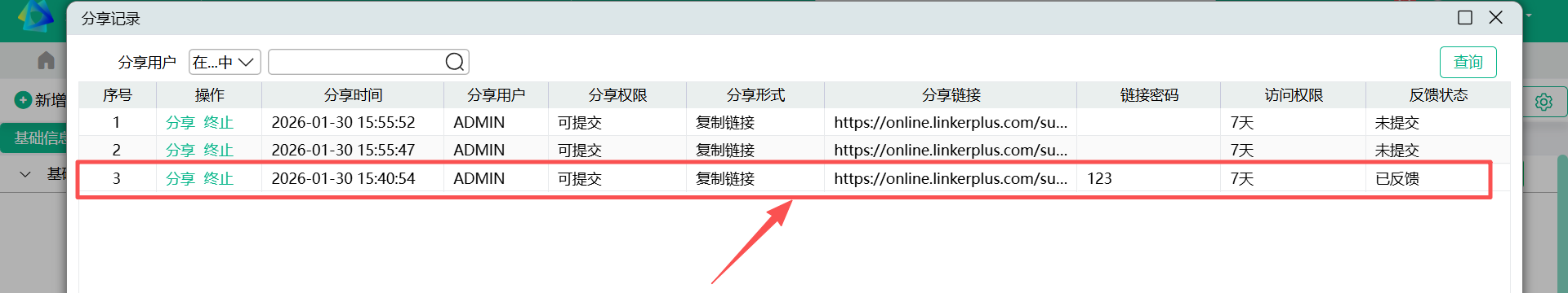 - 通过分享记录可查看来源单据已经做过多少次分享,同时可以看到每条分享记录的状态,是否已做了反馈等