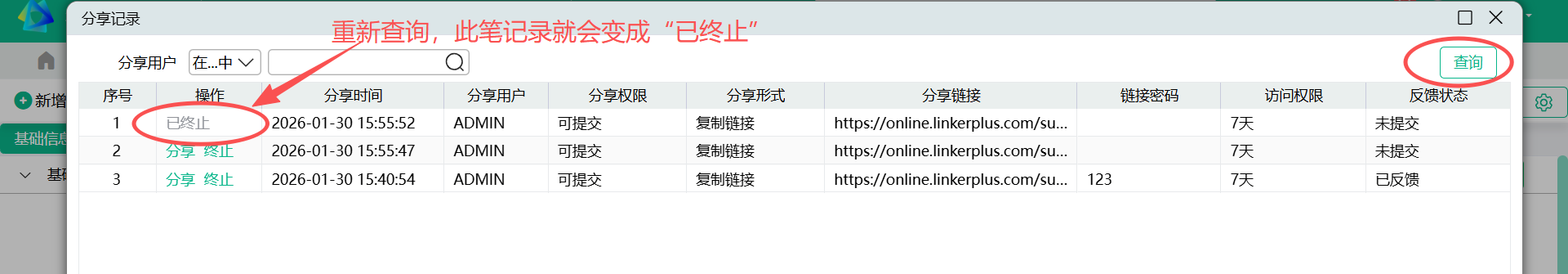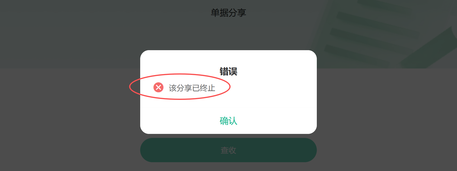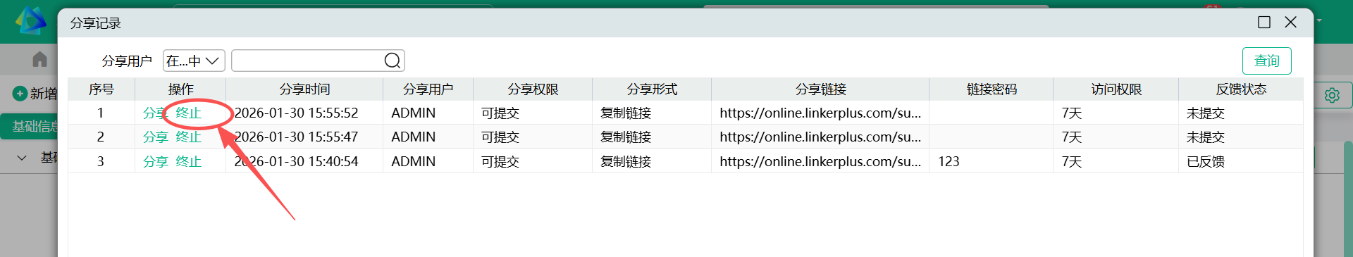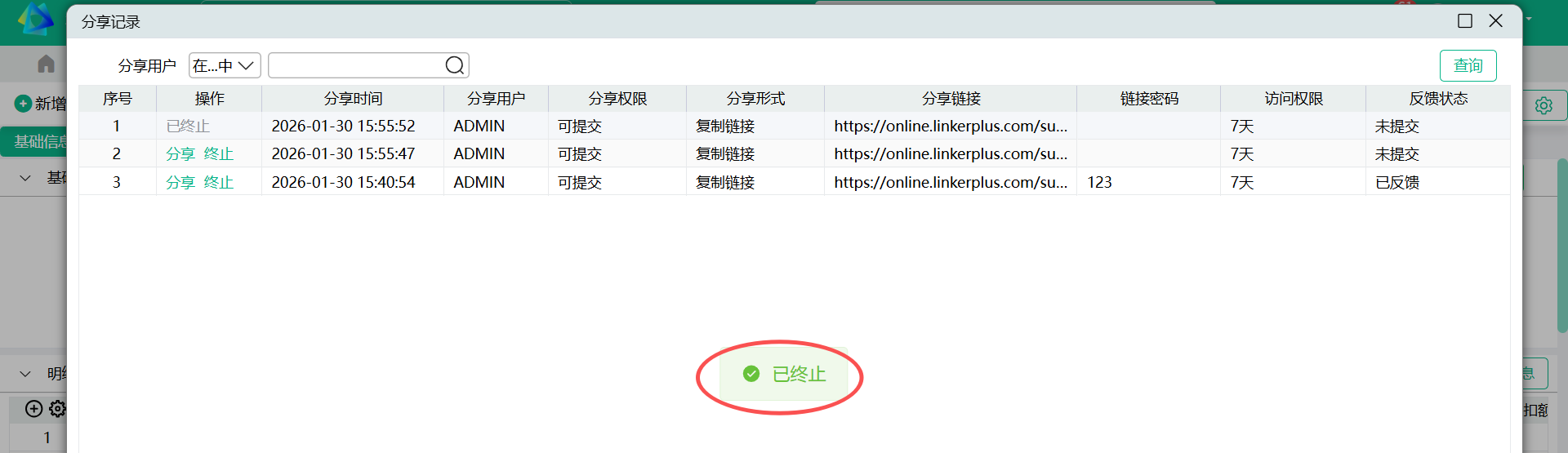 - 分享记录窗口,列操作提供“终止”按钮,点击“终止”后,继续访问此链接会给出提示,告知接收人此分享已被终止