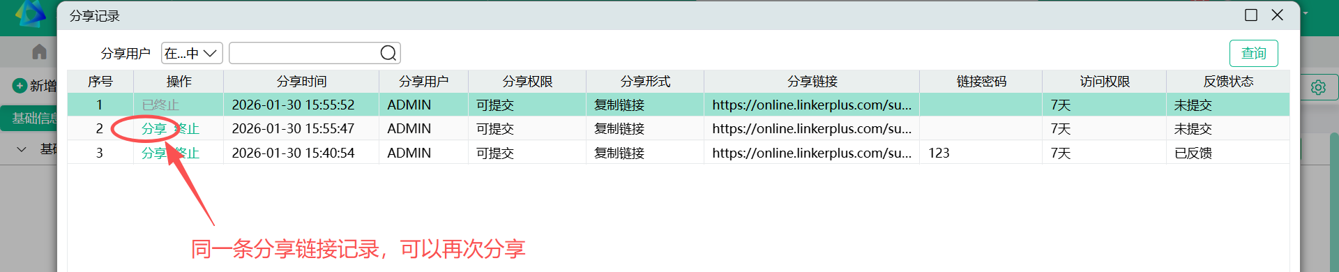 - 分享记录窗口,列操作提供“分享”按钮,相同分享记录可以再次分享