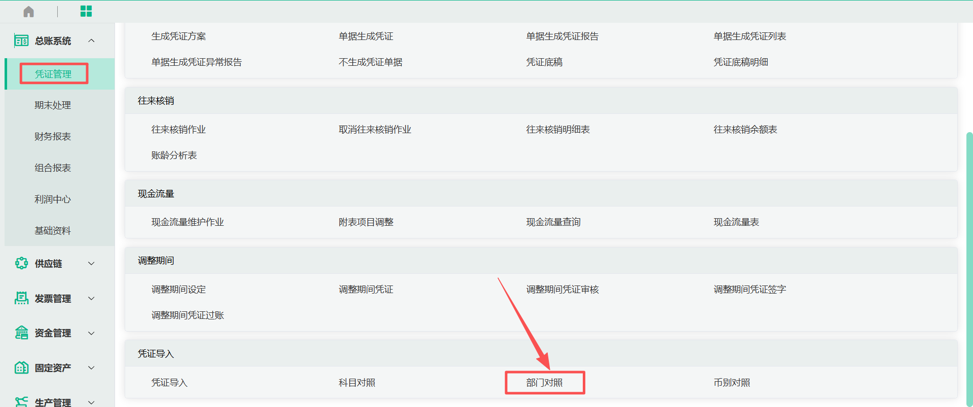菜单位置:总账系统——凭证管理——凭证导入——部门对照