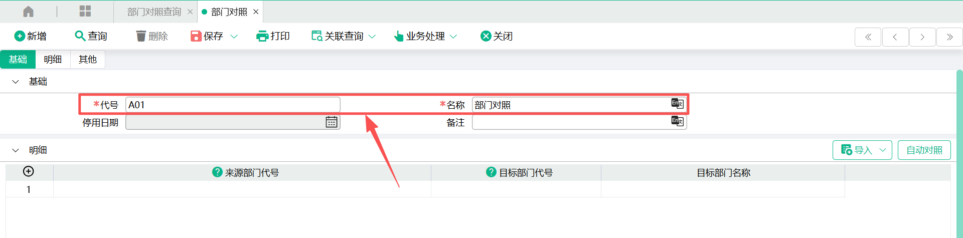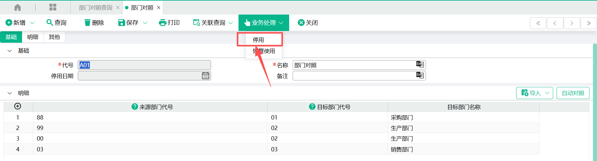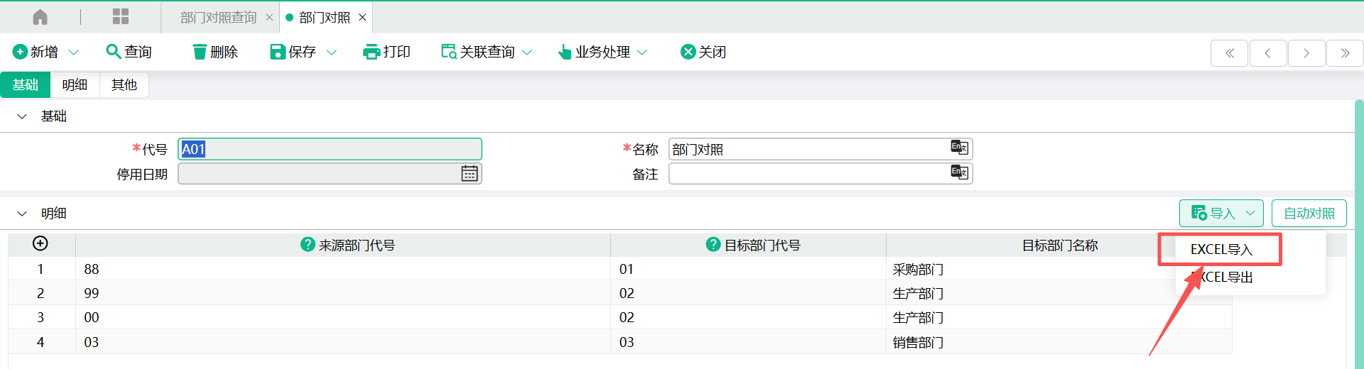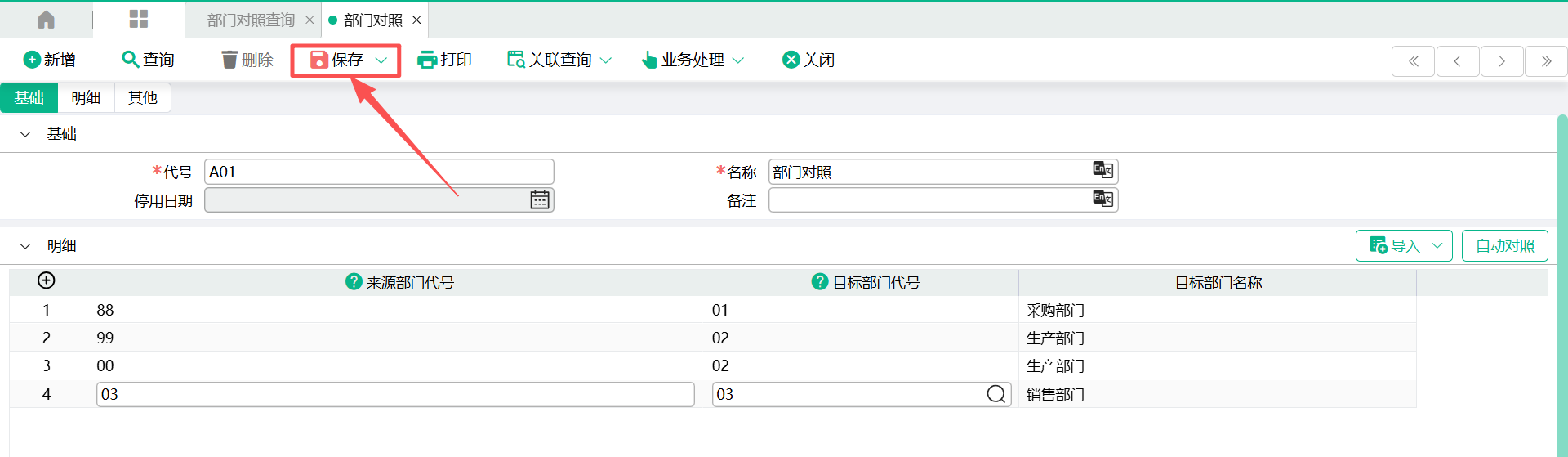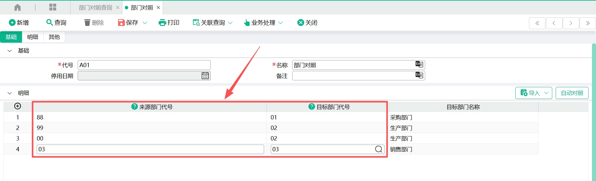 3、当来源部门代号与现系统部门代号相同时,可以使用“自动对照”按钮,自动回写“目标部门代号”栏位的值
