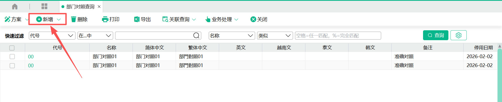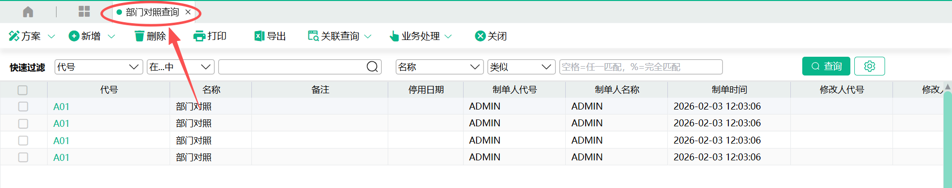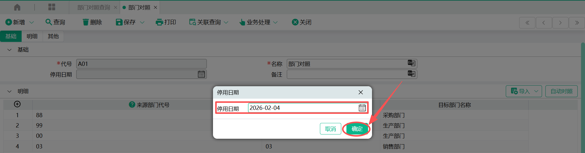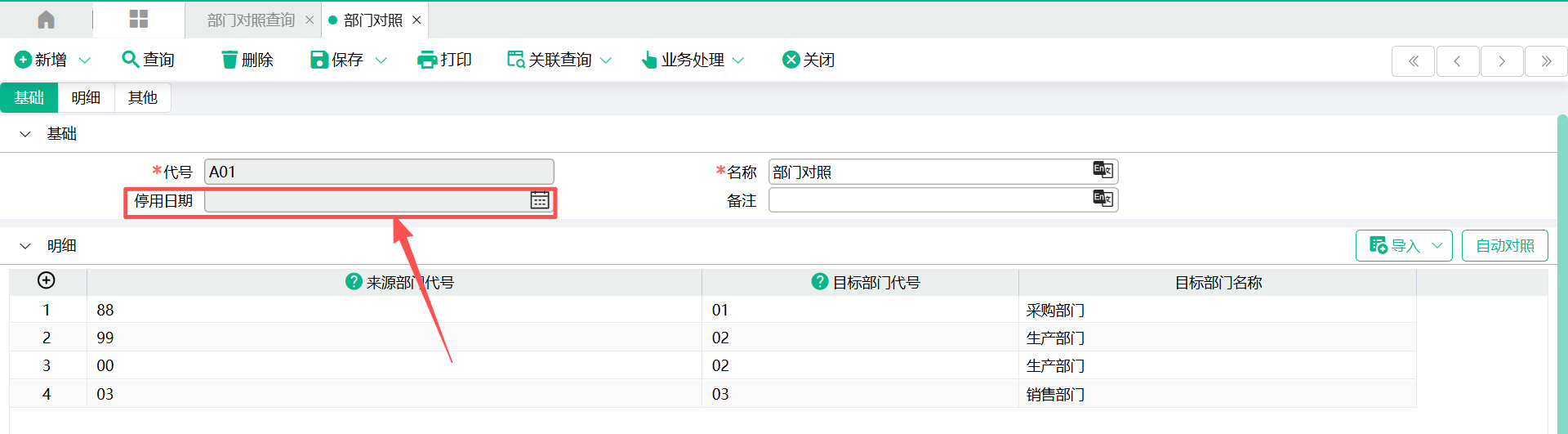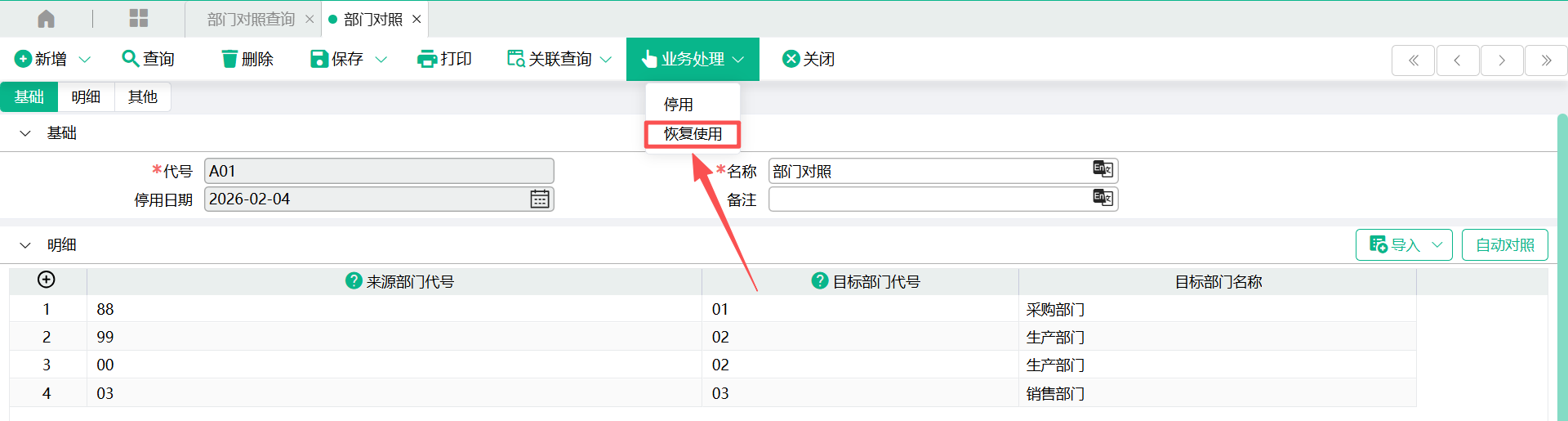 3、当来源部门代号与现系统部门代号相同时,可以使用“自动对照”按钮,自动回写“目标部门代号”栏位的值
