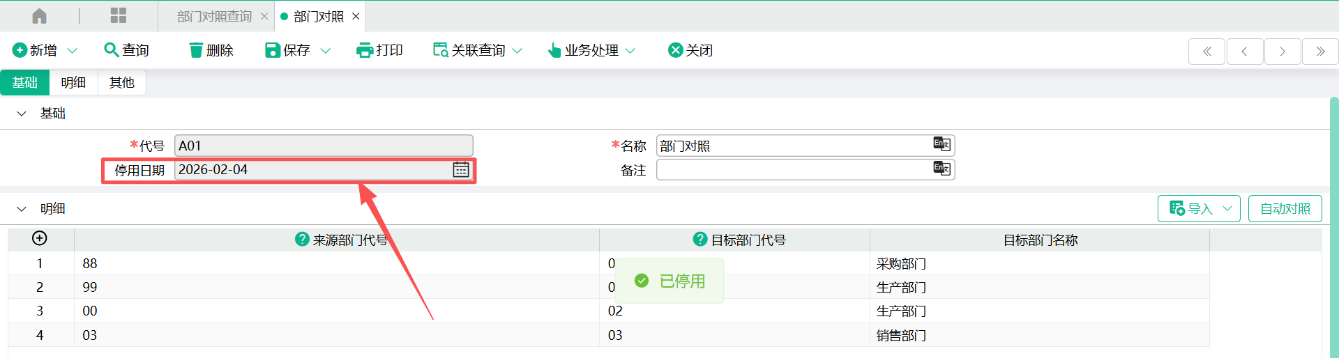 设置停用,会同步回写“停用日期”