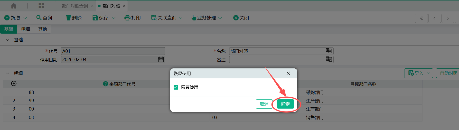 恢复使用,会同步清空“停用日期”