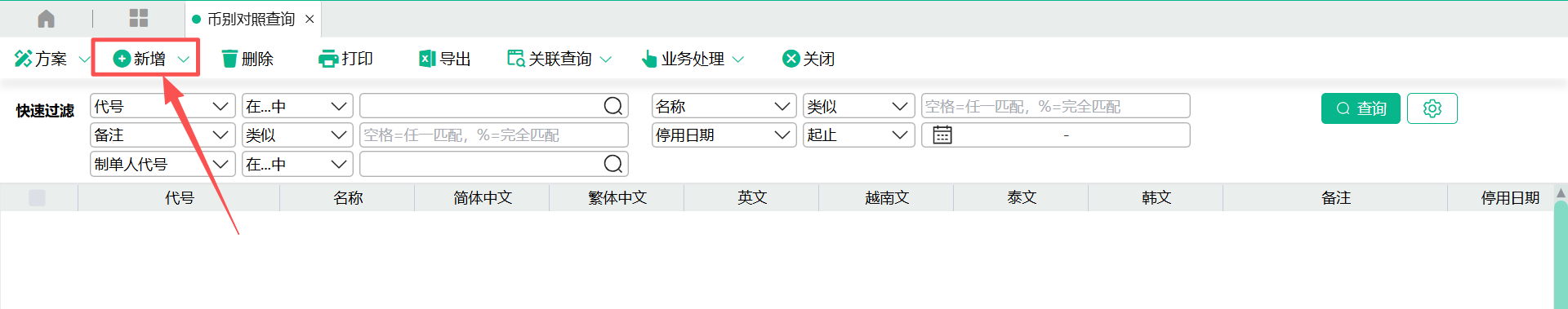 - 点击菜单,进入查询画面,点击【新增】按钮