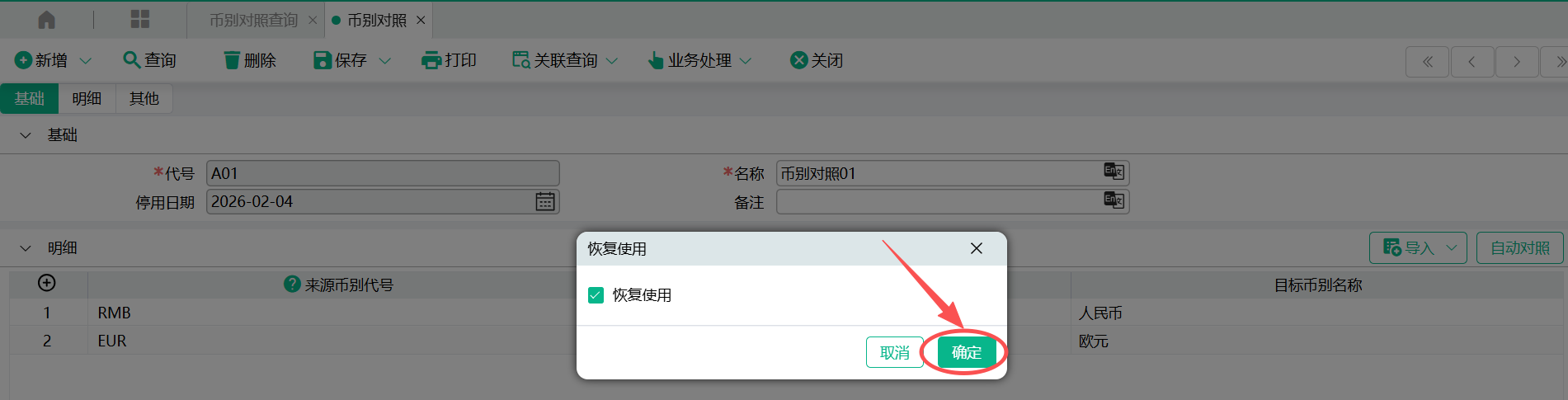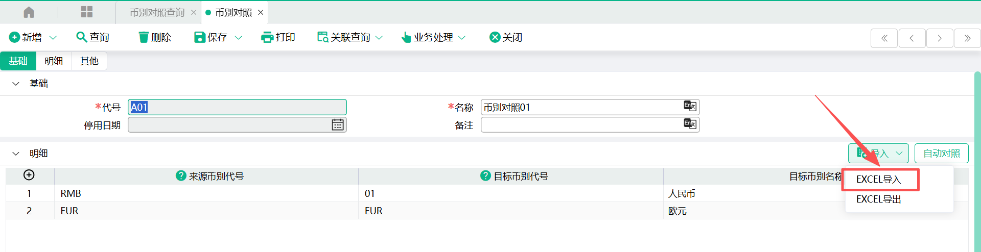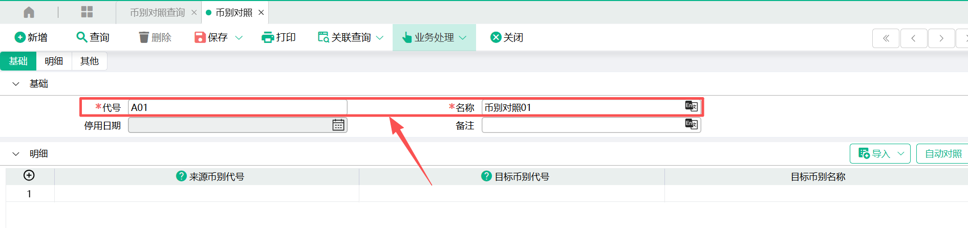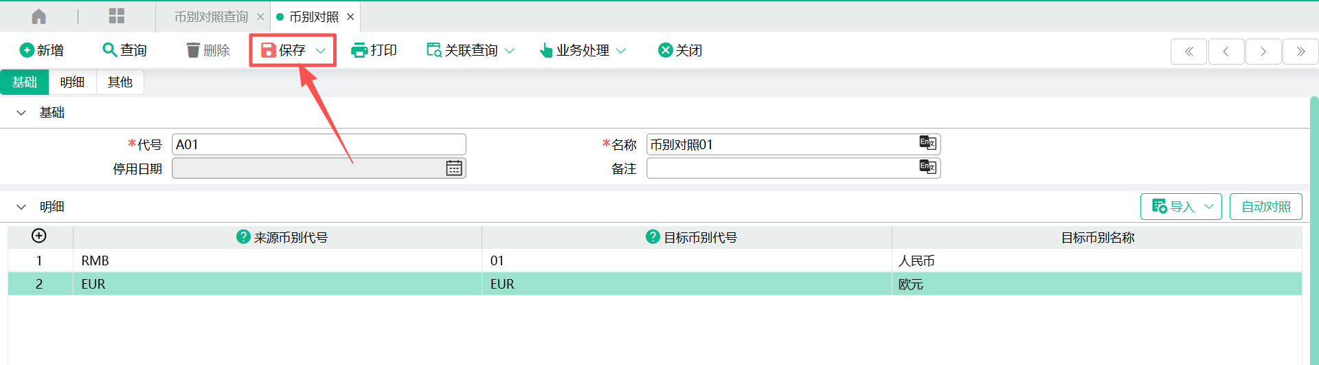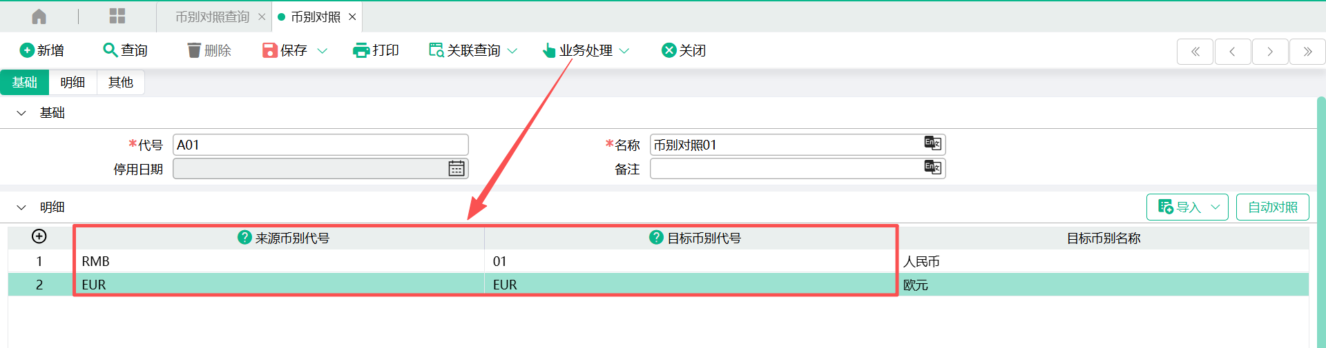 3、当来源币别代号与现系统币别代号相同时,可以使用“自动对照”按钮,自动回写“目标币别代号”栏位的值