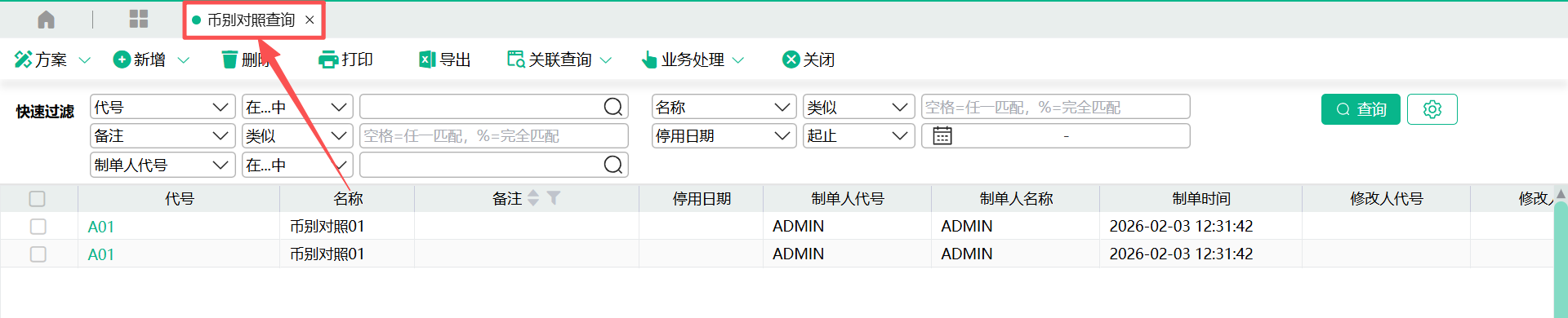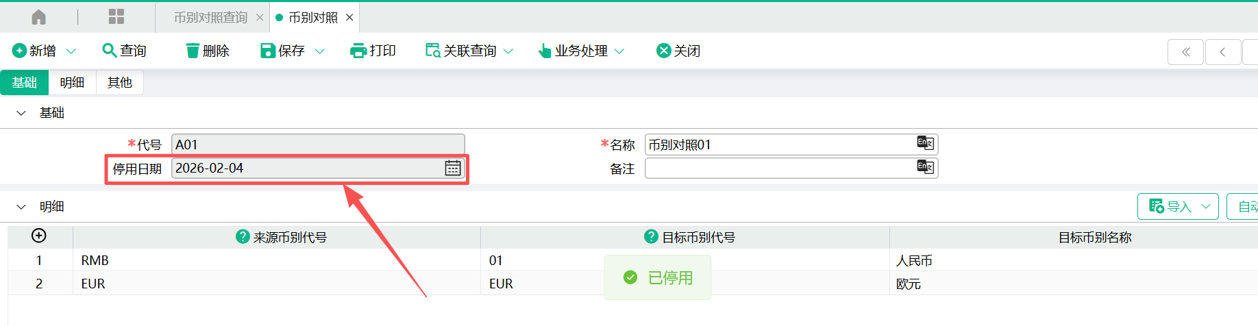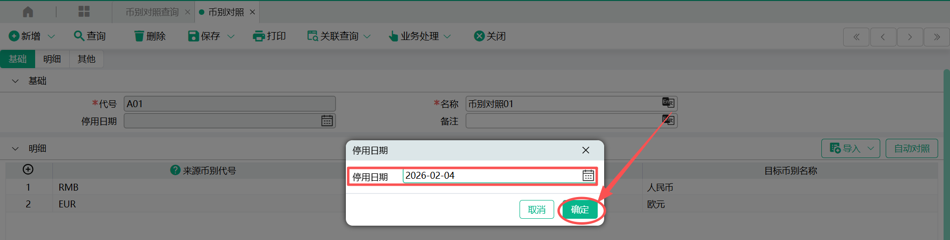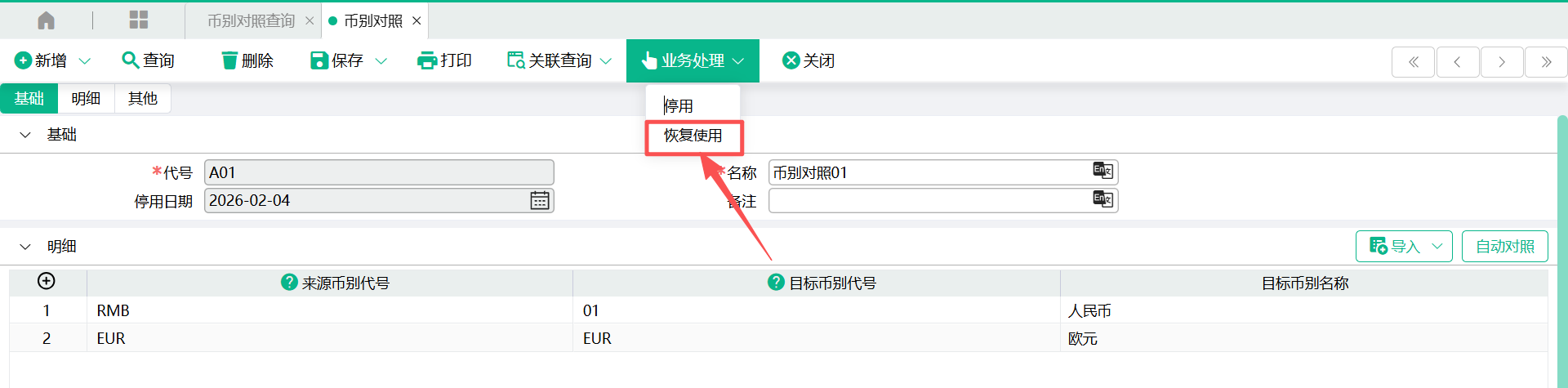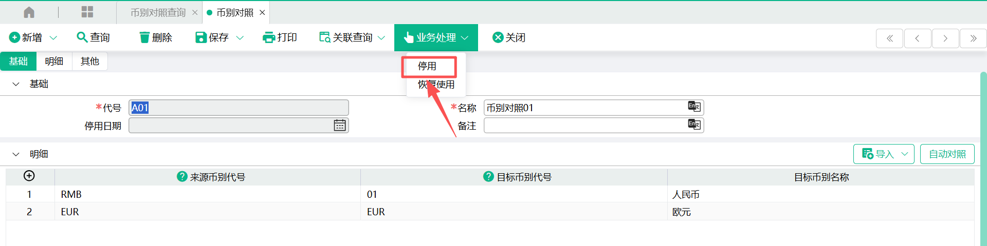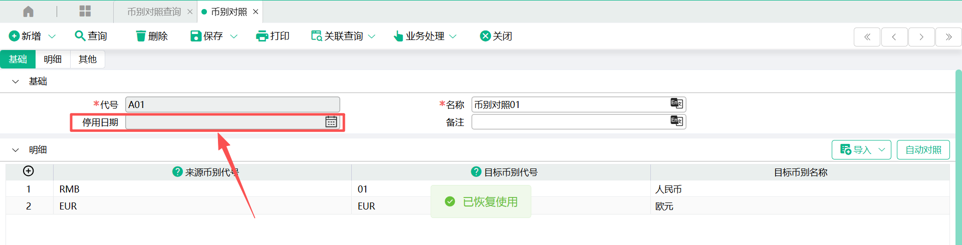 3、当来源币别代号与现系统币别代号相同时,可以使用“自动对照”按钮,自动回写“目标币别代号”栏位的值