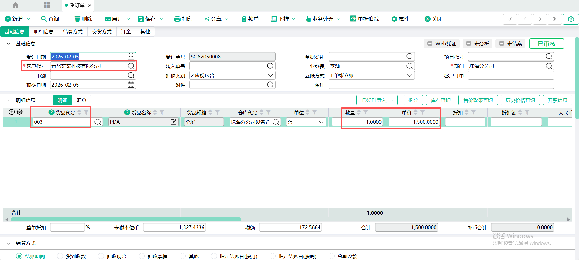 (1)新增一张【受订单】