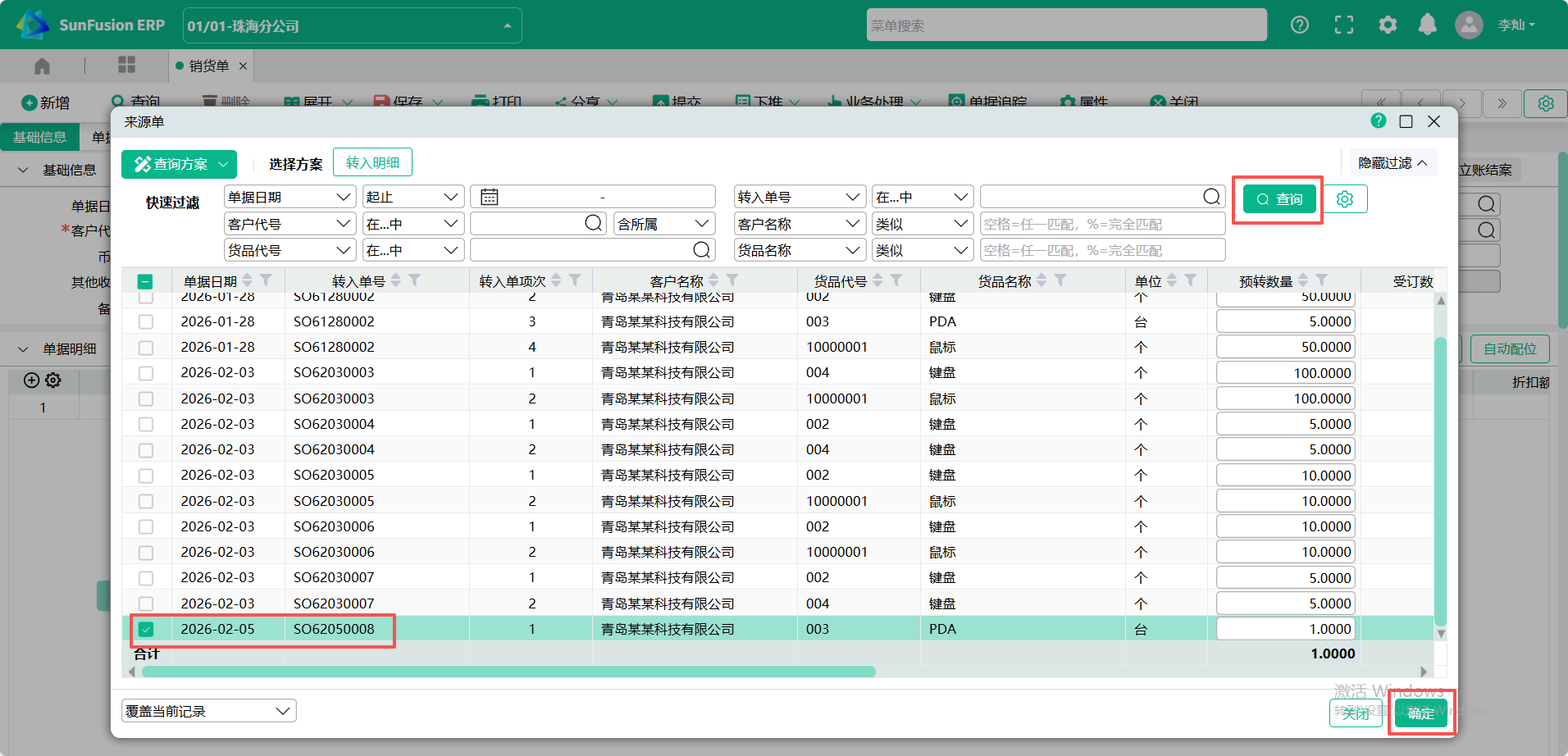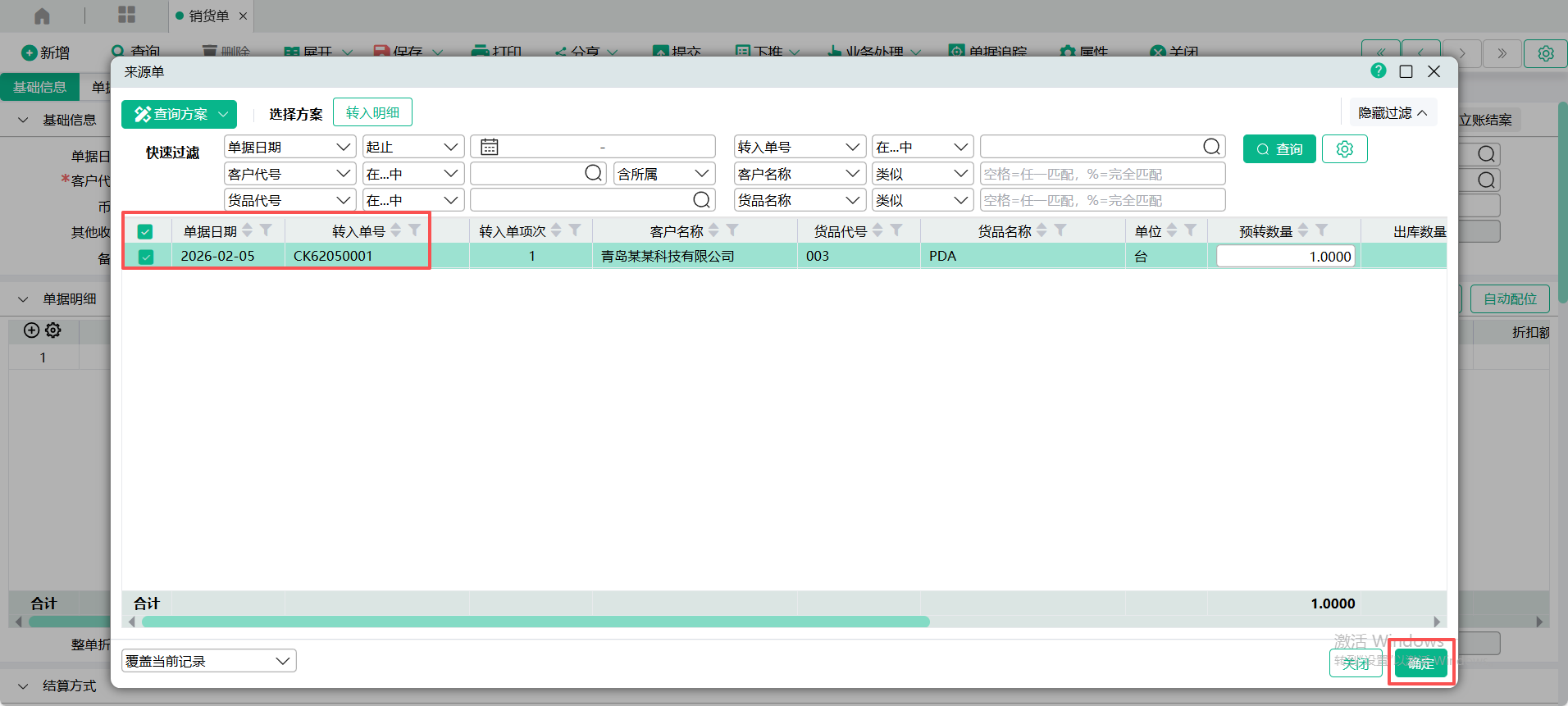 (2)进入【销货单】页面,点入表头【转入单号】查询窗口,点击【从受订单转入】,查询出受订单,勾选要转入的单据记录,点【确定】 ;