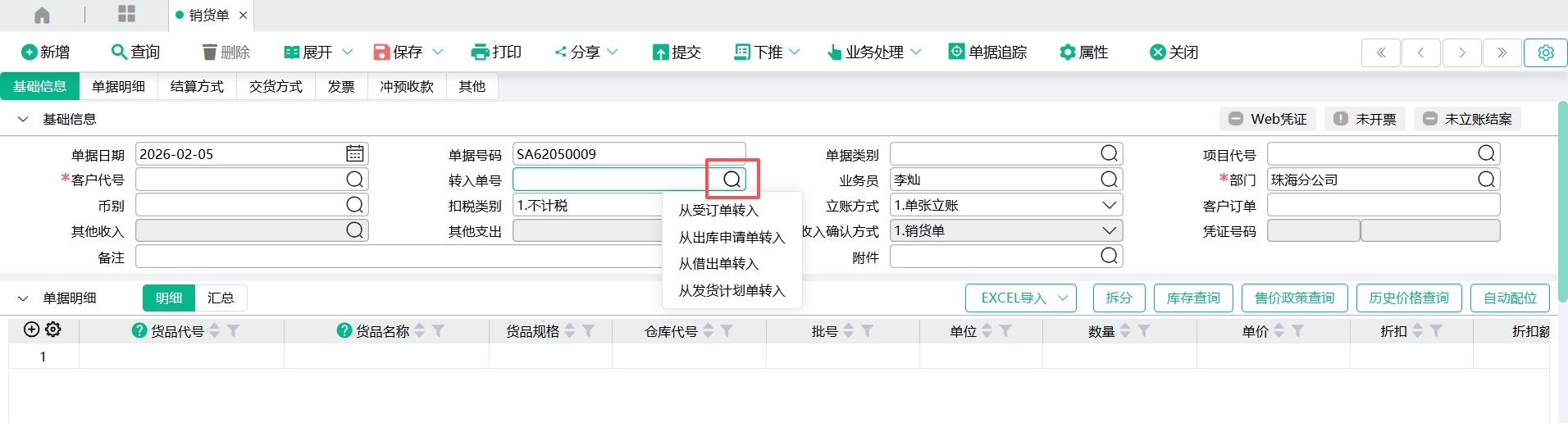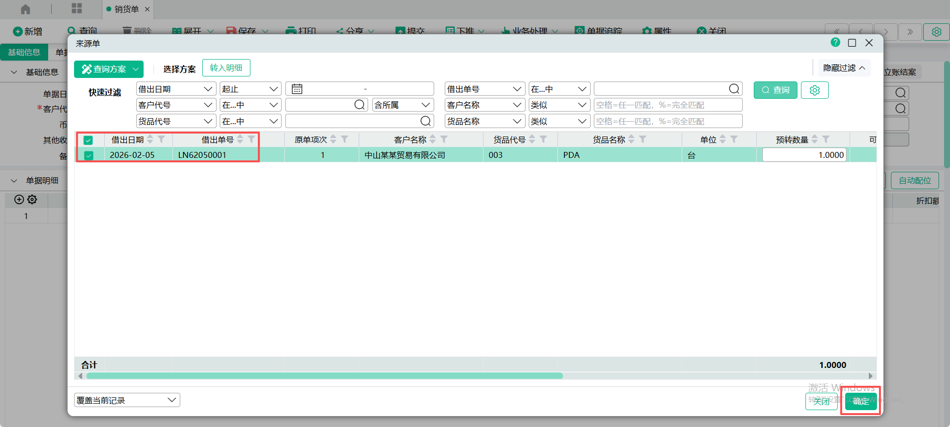 (2)、进入【销货单】页面,点入表头【转入单号】查询窗口,点击【从借出单转入】,查询出受订单,勾选要转入的单据记录,点【确定】 ;