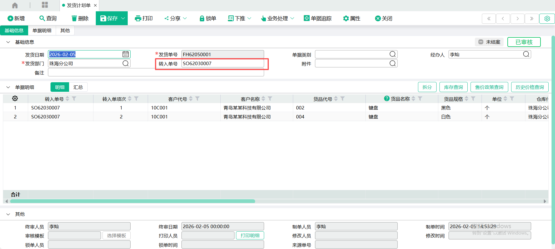 5、转入 【发货计划单】