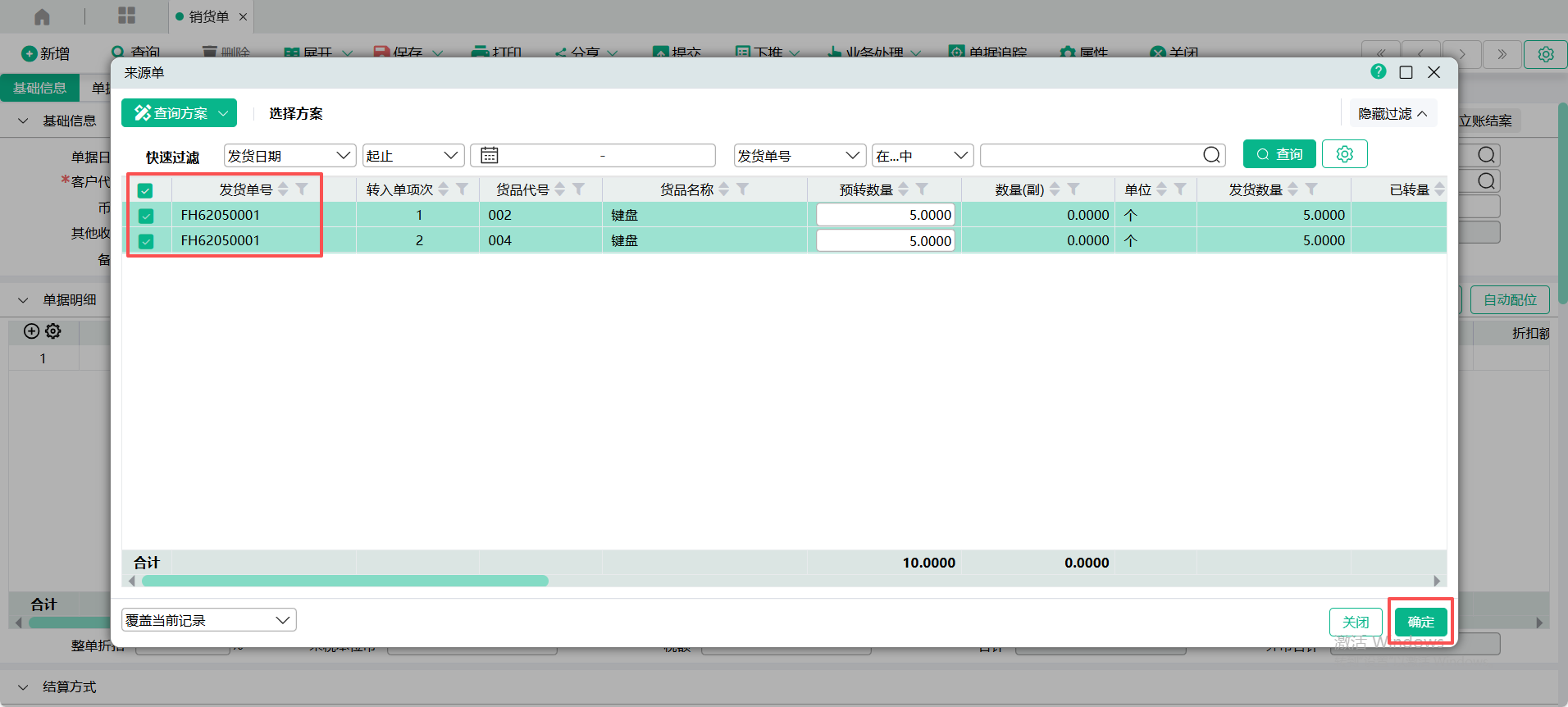 (2)、进入【销货单】页面,点入表头【转入单号】查询窗口,点击【从发货计划单转入】,查询出受订单,勾选要转入的单据记录,点【确定】 ;
