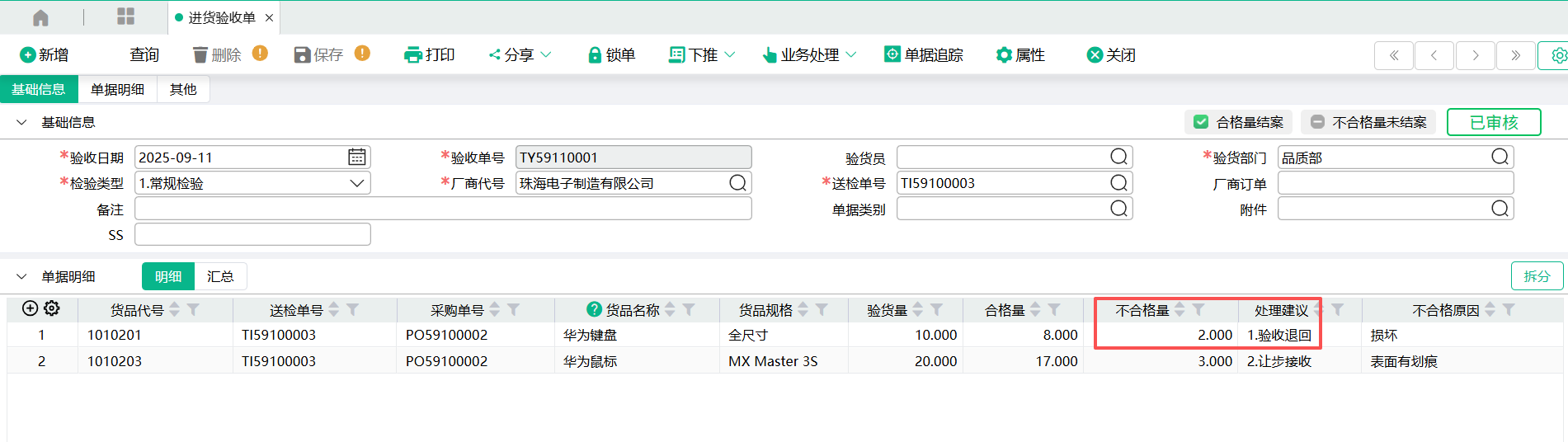 (1) 进货验收单表身有不合格量,且处理建议为1.验收退回。