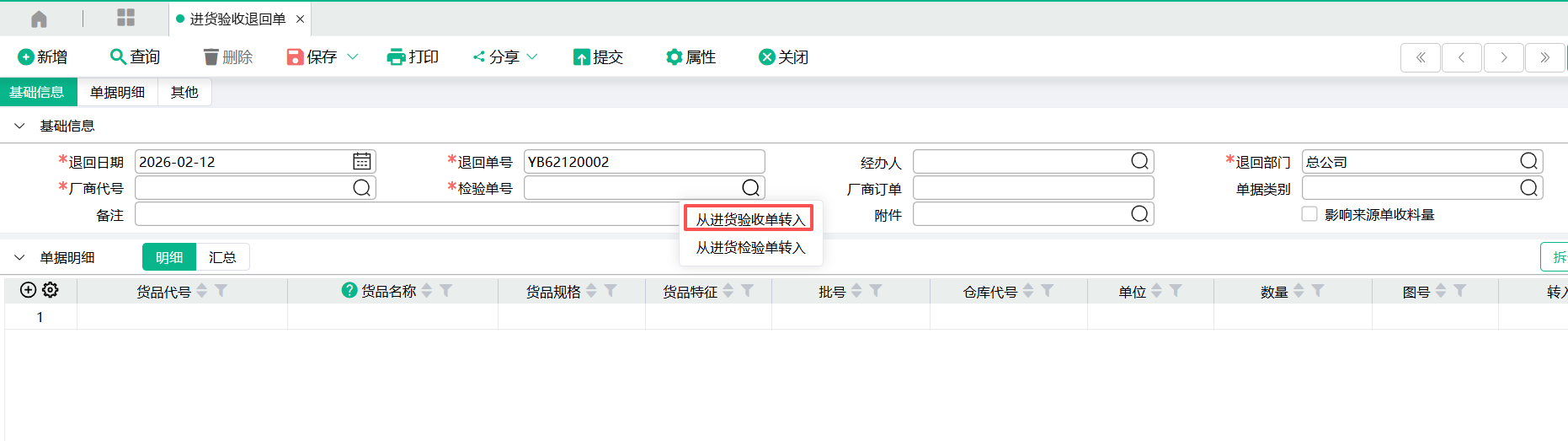 | 退回单号 | 根据编码规则自动编码 |