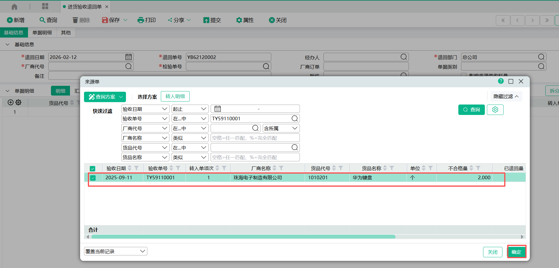 (2)打开进货验收退回单,检验单号选择从进货验收单转入,过滤到表身。