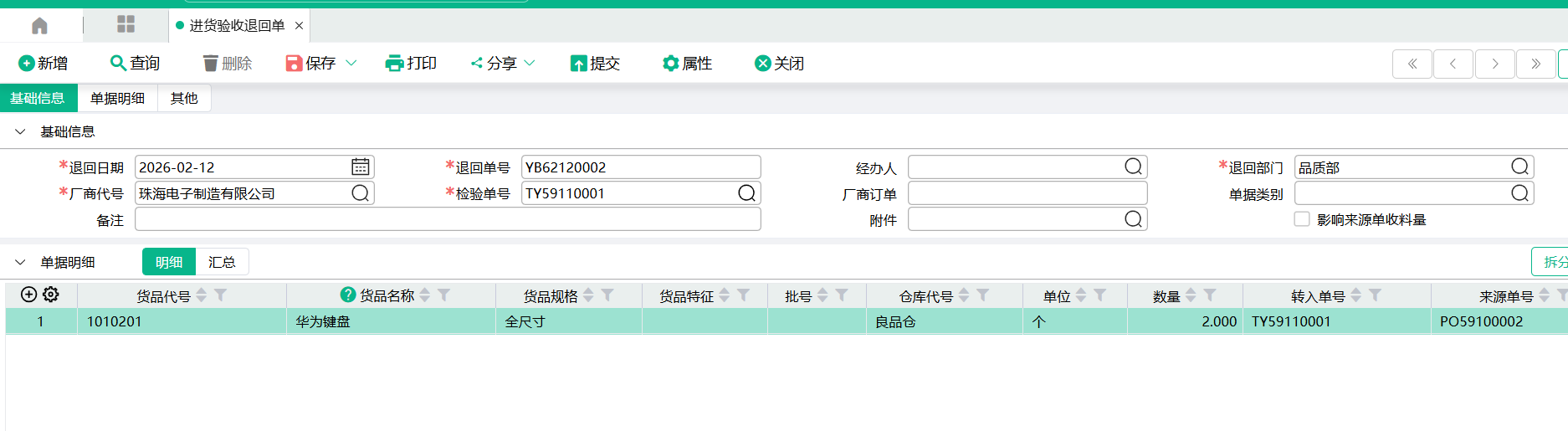 (2) 对采购单影响: 验收退回单保存走审核,回写采购单表身的送检量(未审核)负数,终审增加送检量(未审核)正数,扣减 采购单表身的送检量。