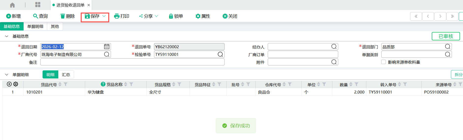 (3) 对库存影响: 验收退回单保存走审核, 回写库存送检量(未审核)负数,终审之后,增加送检量(未审核)正数,扣减扣减库存里的送检量。