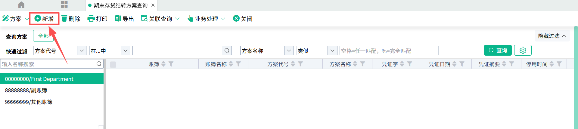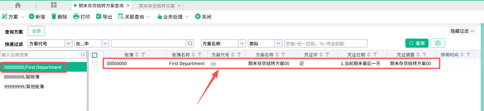 - 查询,选择左侧账簿,右侧会列示方案资料