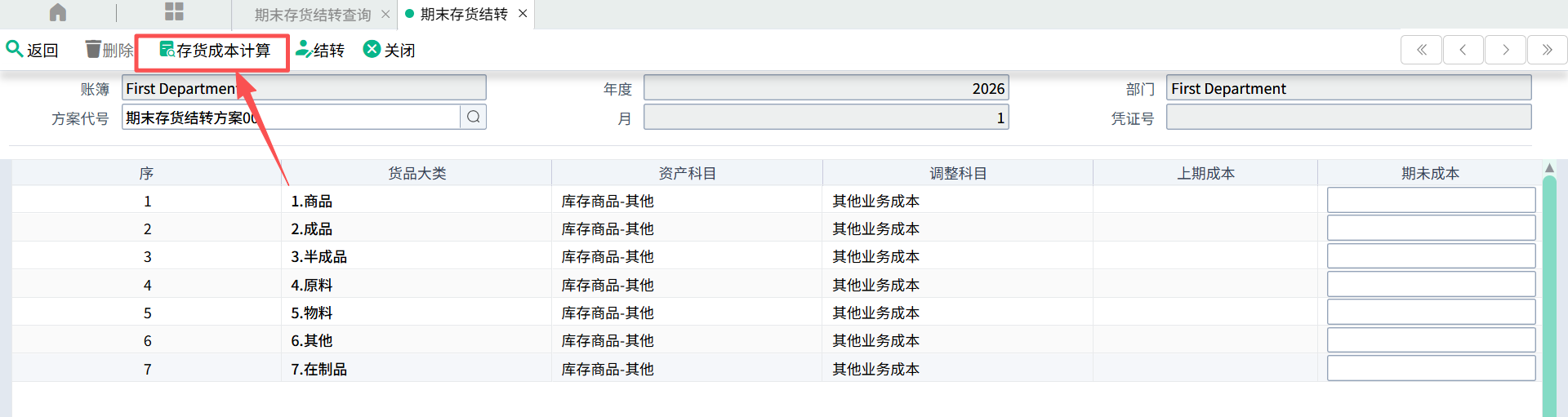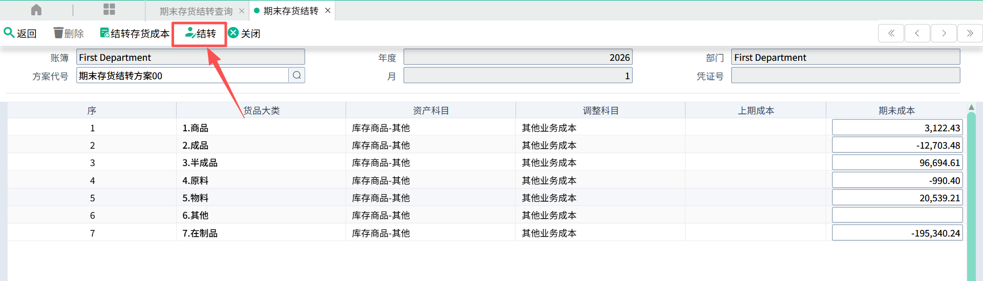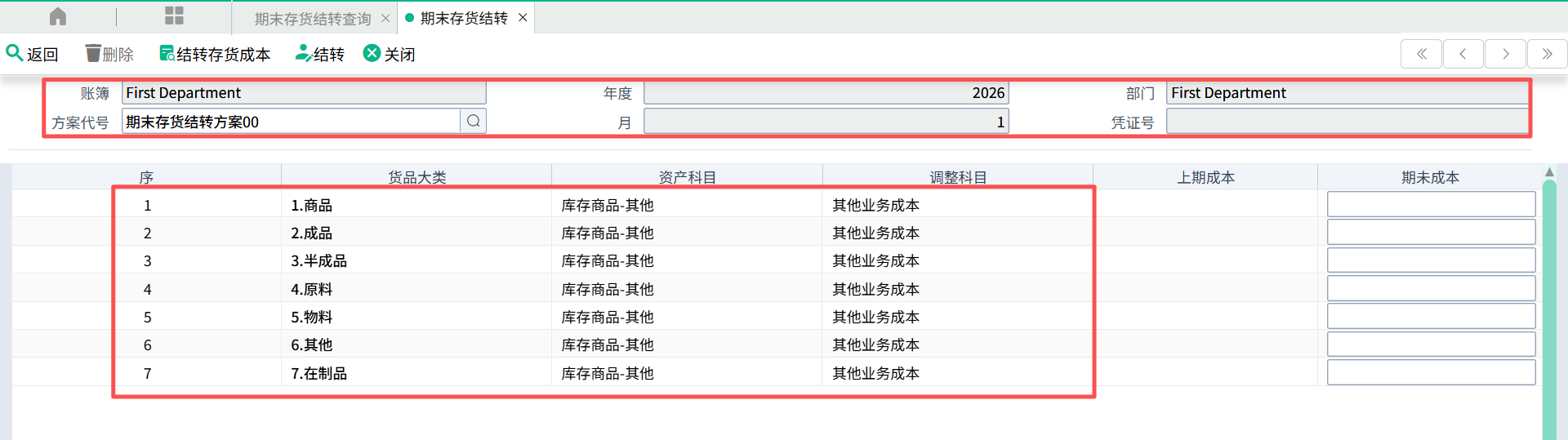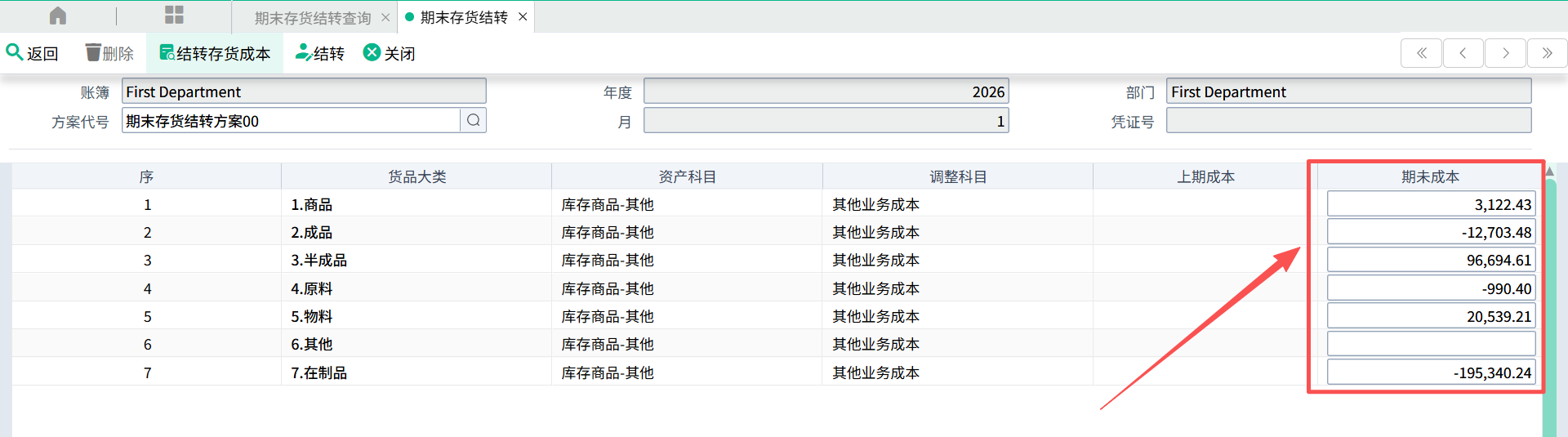 针对账簿+年度+部门,对于每个期间的期末存货进行结转处理