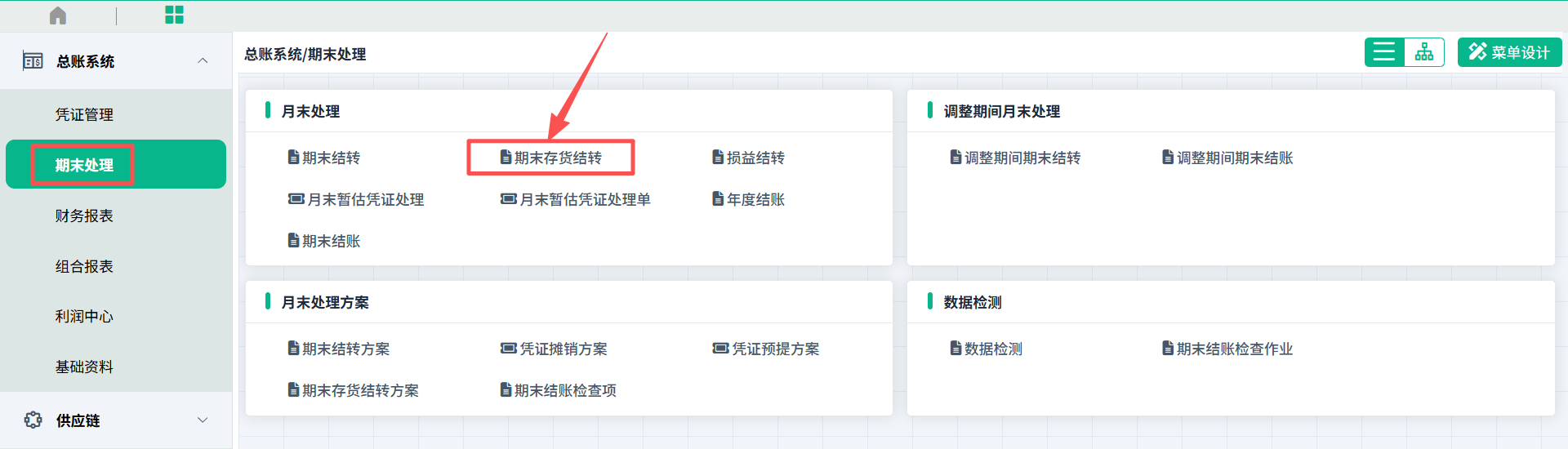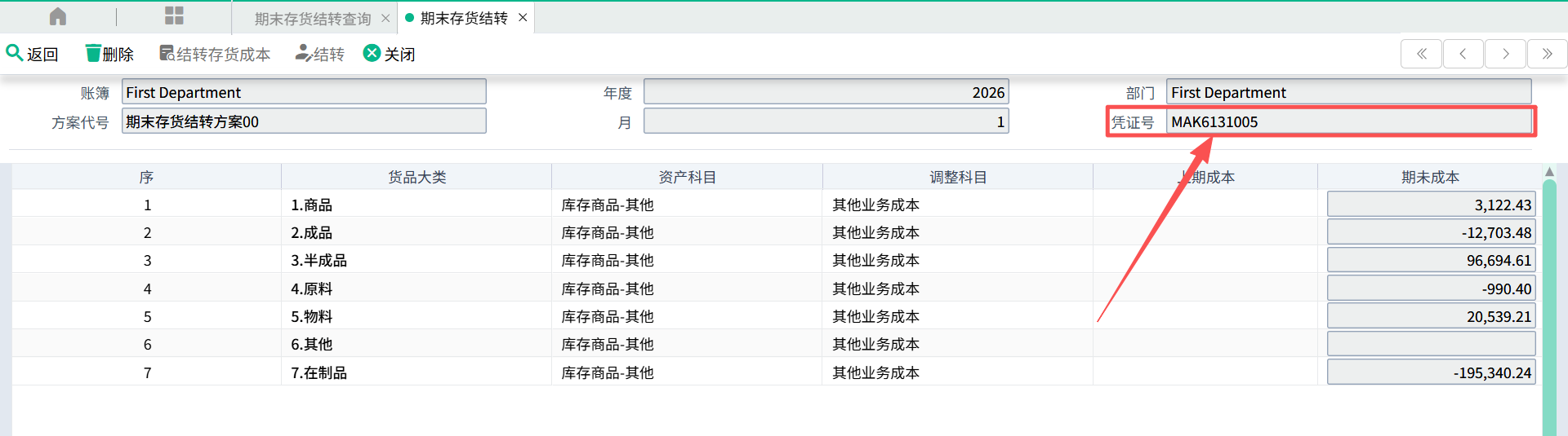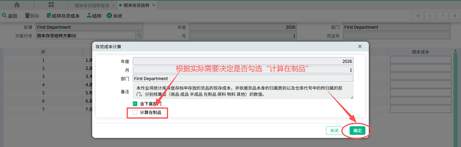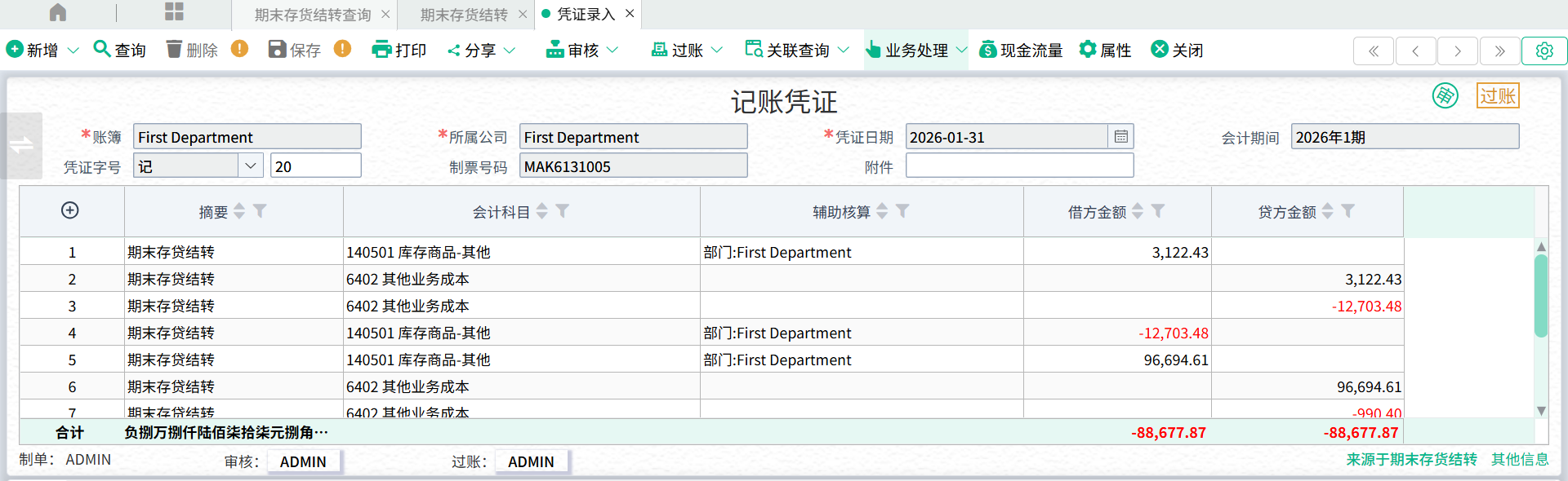 针对账簿+年度+部门,对于每个期间的期末存货进行结转处理