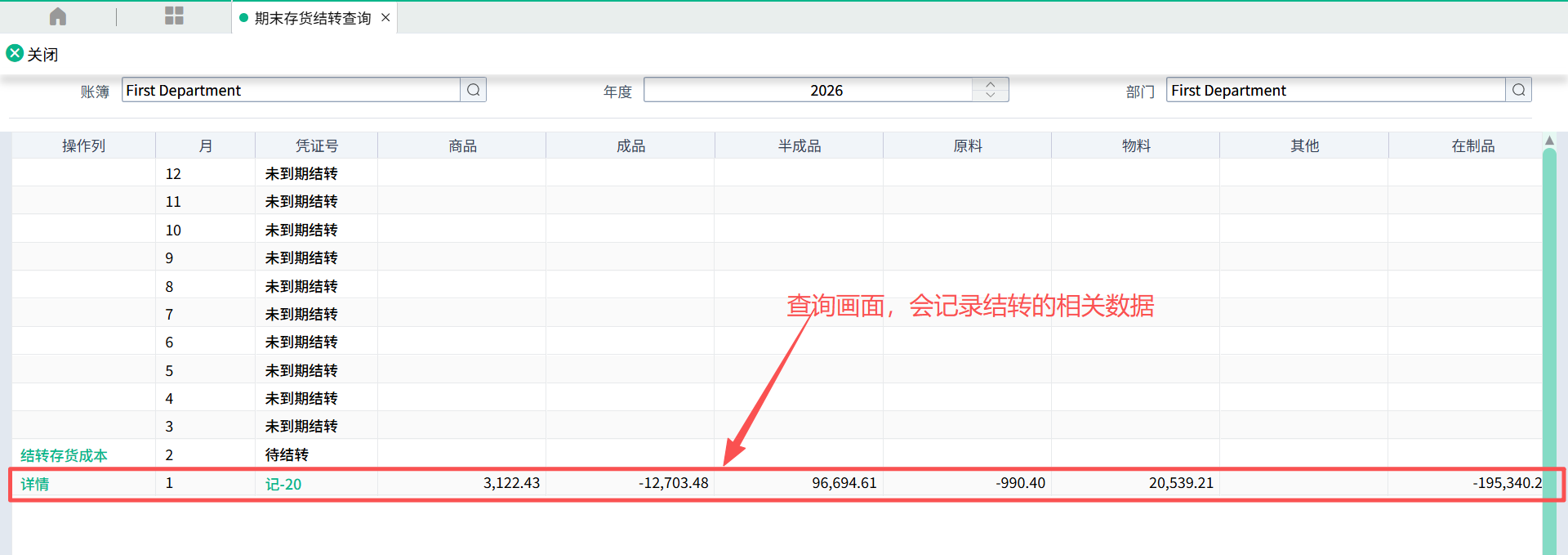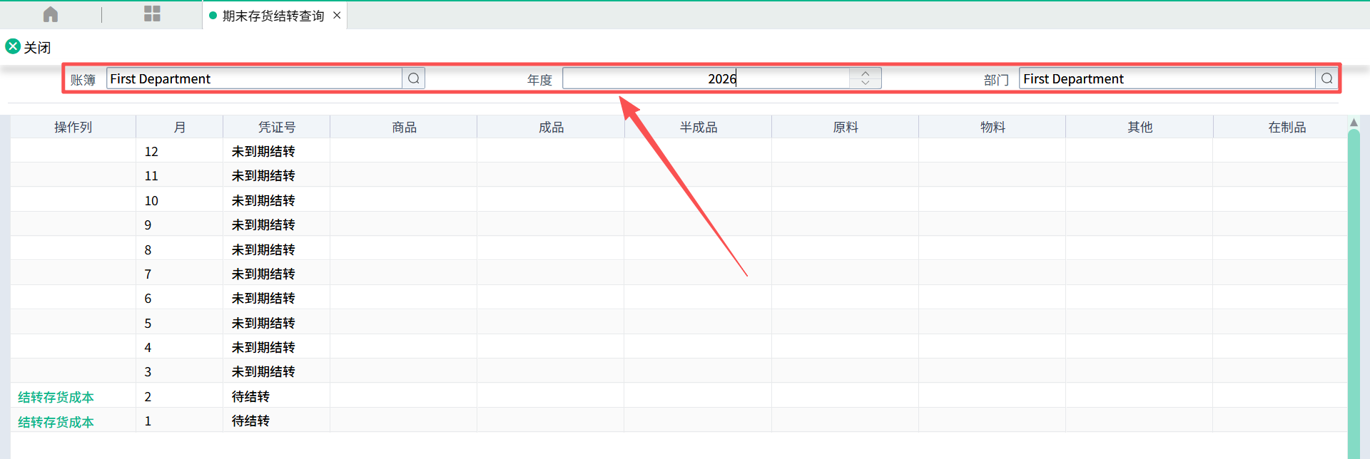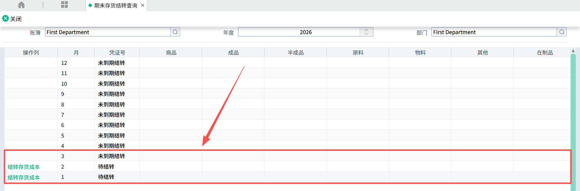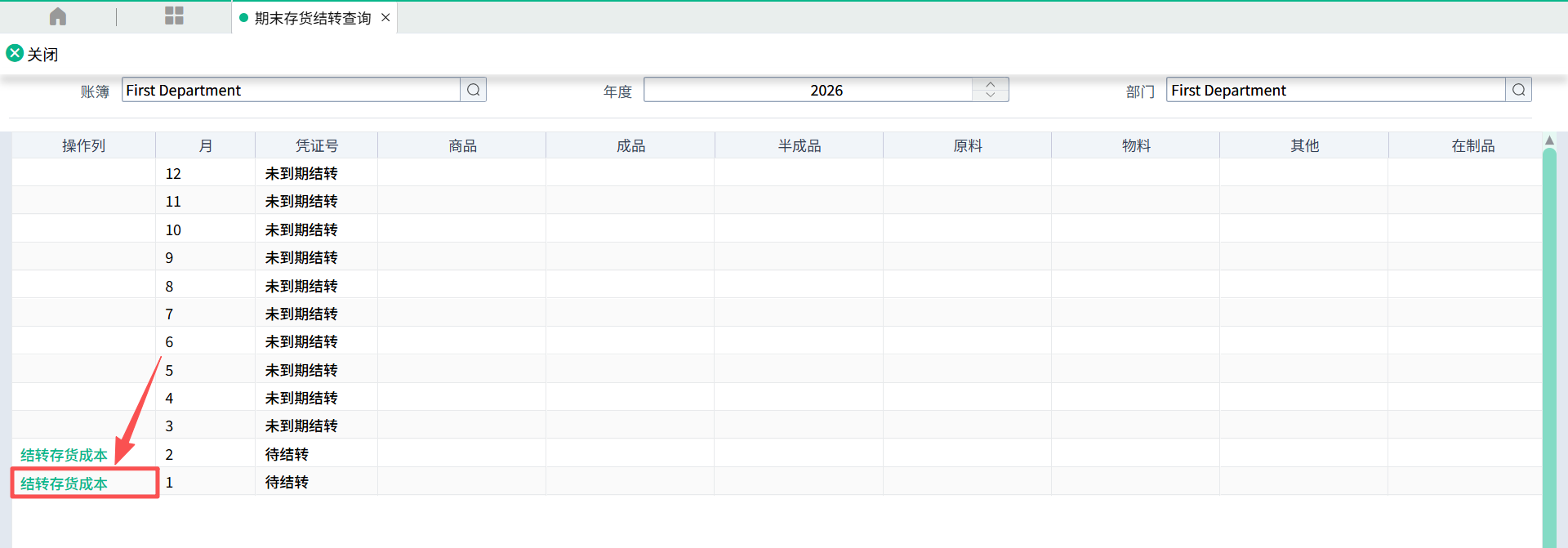 - 表身根据上方账簿+年度+部门,自动过滤出表身数据,表身数据列示12个月;需要结转存货成本的月份会显示“待结转”并提供“结转存货成本”按钮;未到期的月份会显示“未到期结转”