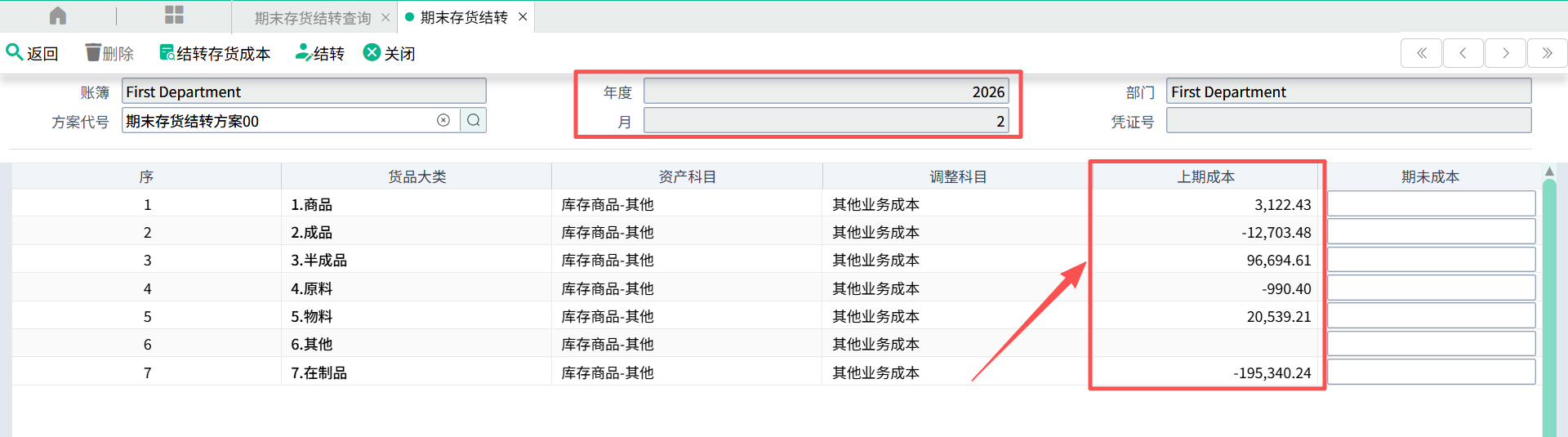 - 结转画面上期成本取值:若结转2月的存货成本,2月的“上期成本”取1月份的期末成本