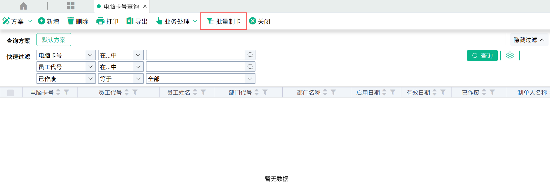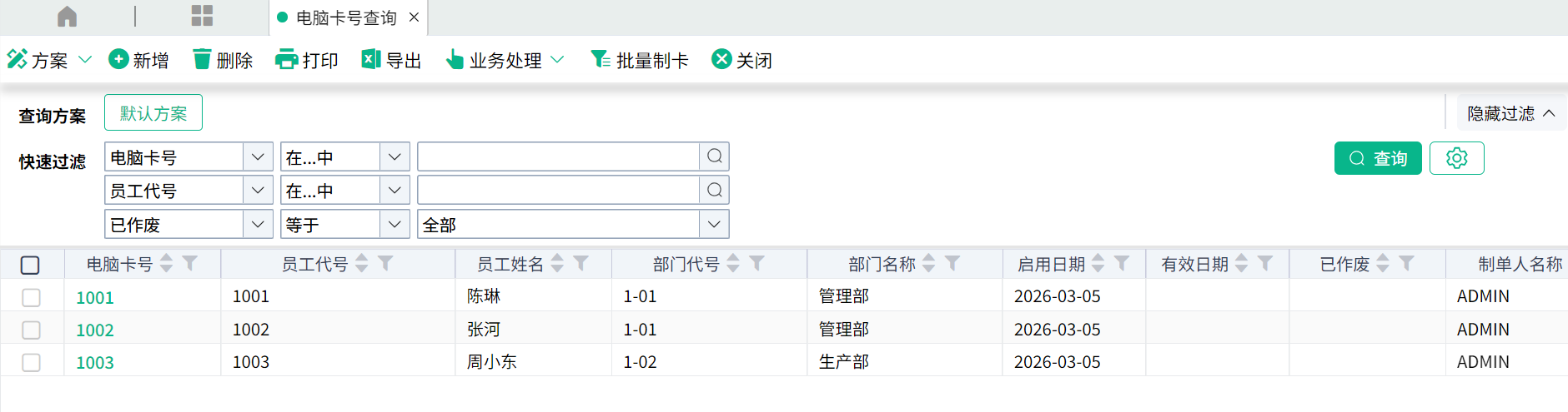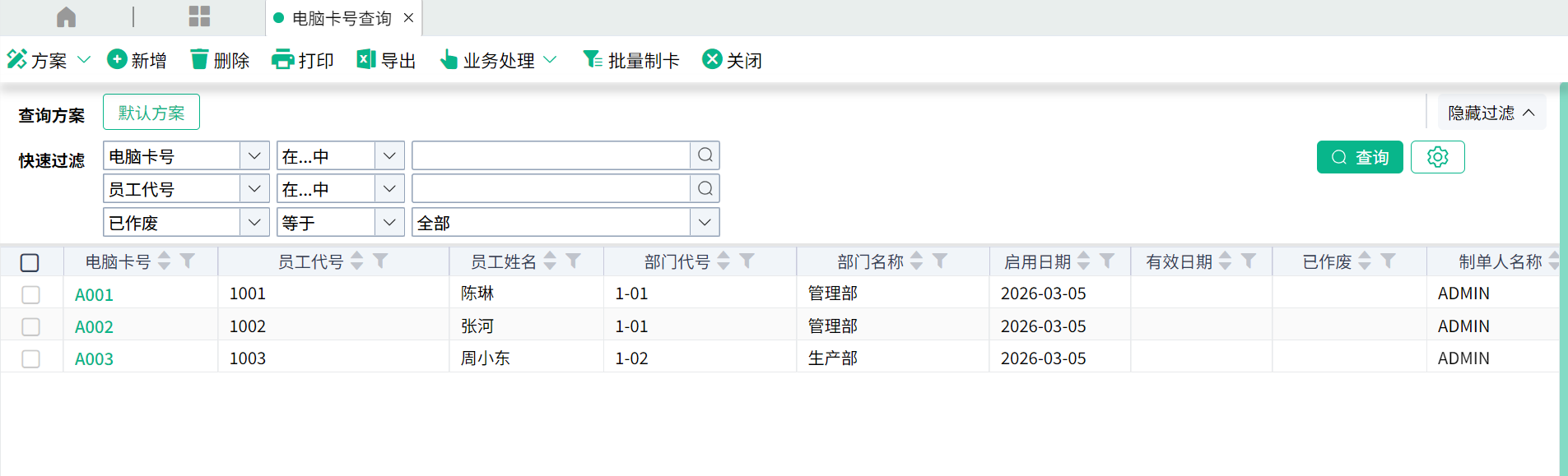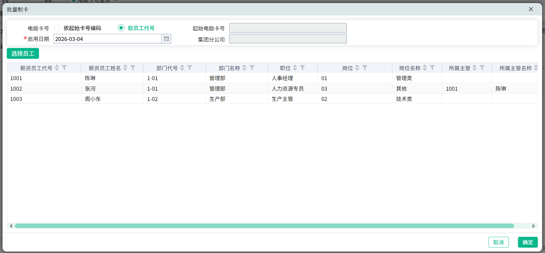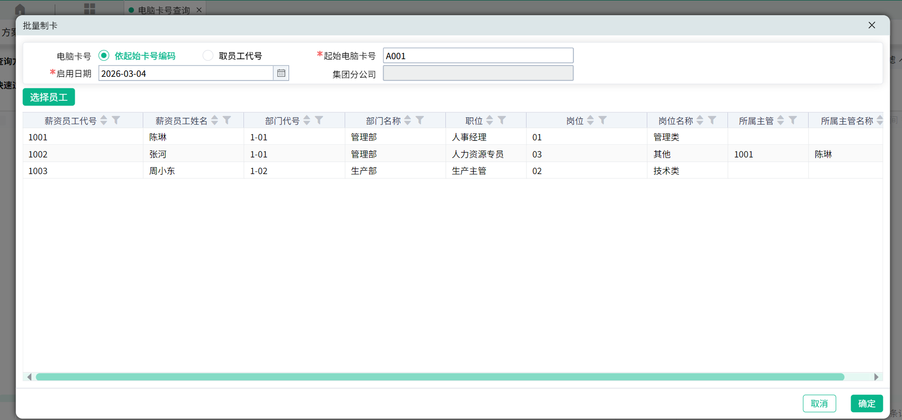 系统会根据起始电脑卡号与所选择的员工,自动生成电脑卡号