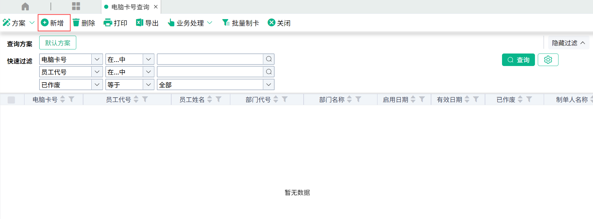 菜单位置:考勤系统——考勤系统 ——基础资料——电脑卡号