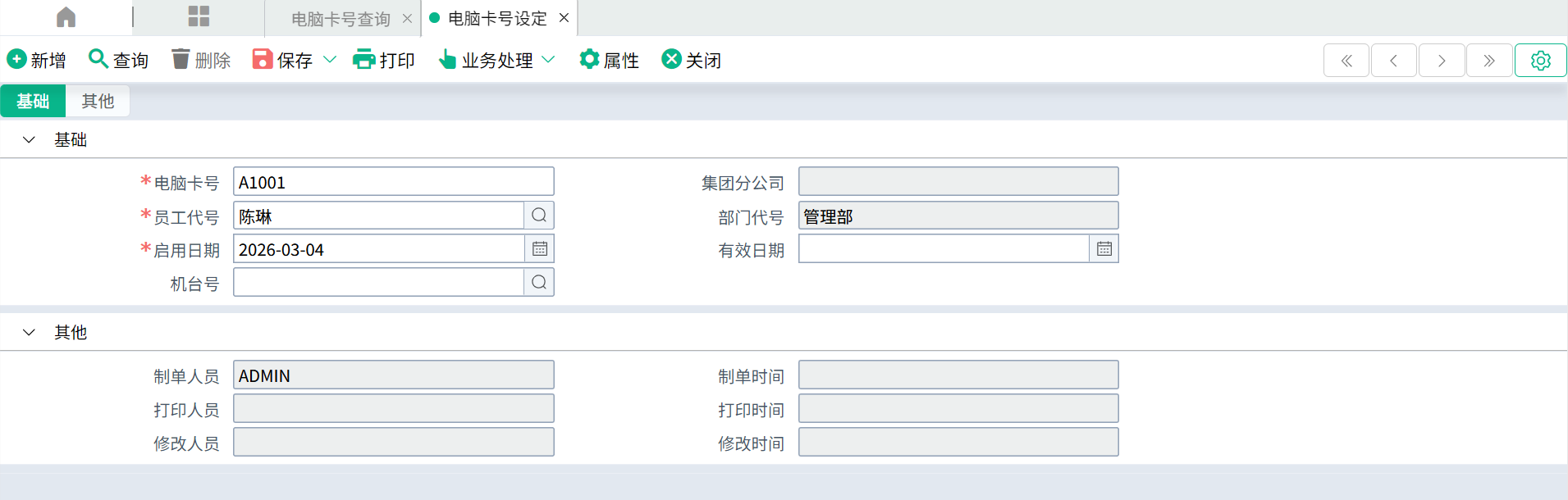 (2)输入电脑卡号、员工代号、启用日期,点【保存】。