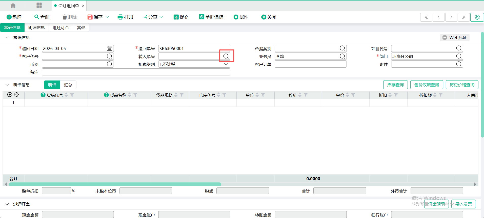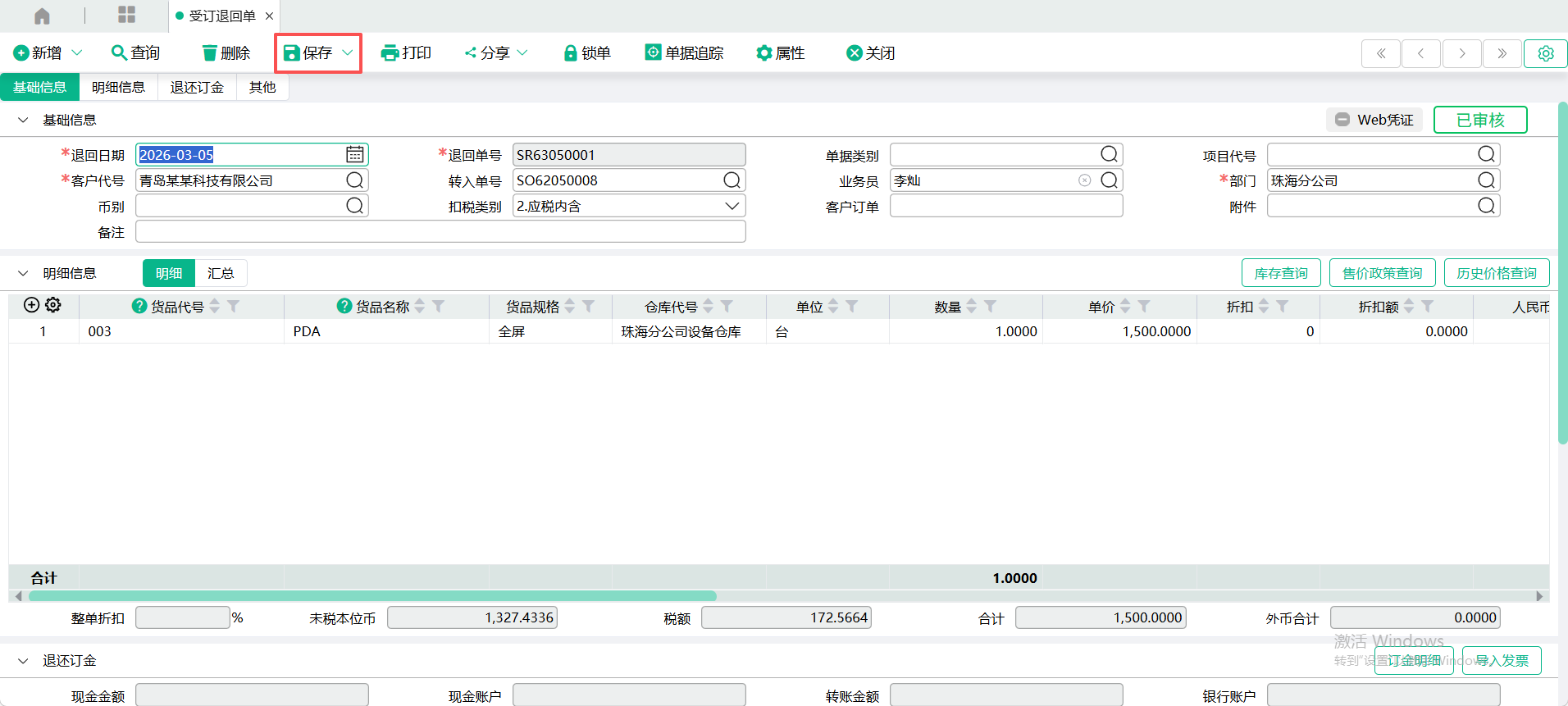 当受订发生退回时,您可以将它记录在本系统的受订退回作业中。在实际业务中虽然发生了受订但实际货物却还未真正出库,故受订退回主要是退回订金,因此受订退回作业就是针对订金退回做处理。
