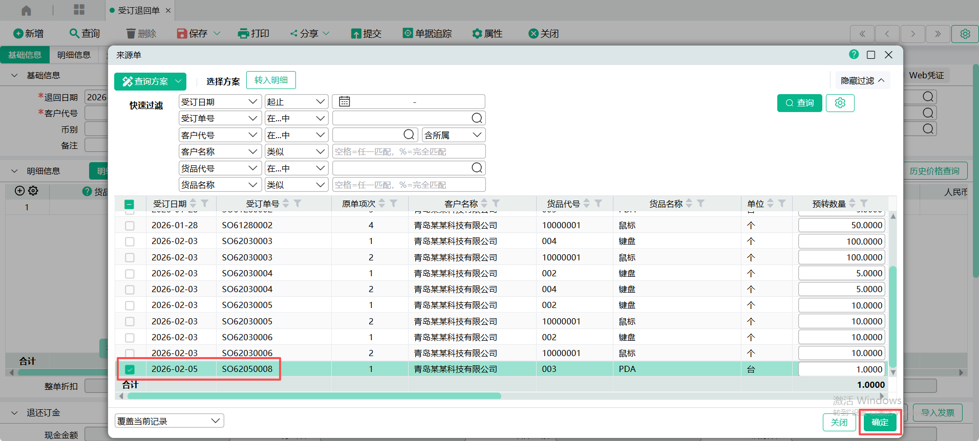 (2)进入【受订退回单】页面,点入表头【转入单号】查询窗口,输入过滤条件,查询出受订单,勾选要转入的单据记录,点【确定】 ;