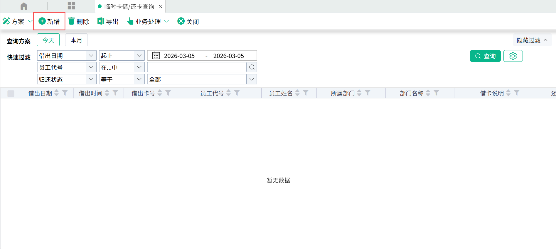 (1)进入【临时卡借/还卡】页面,点击【新增】