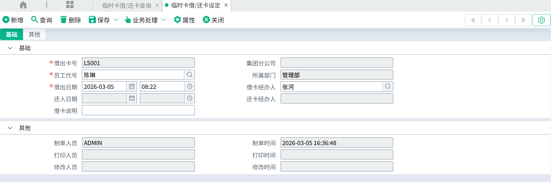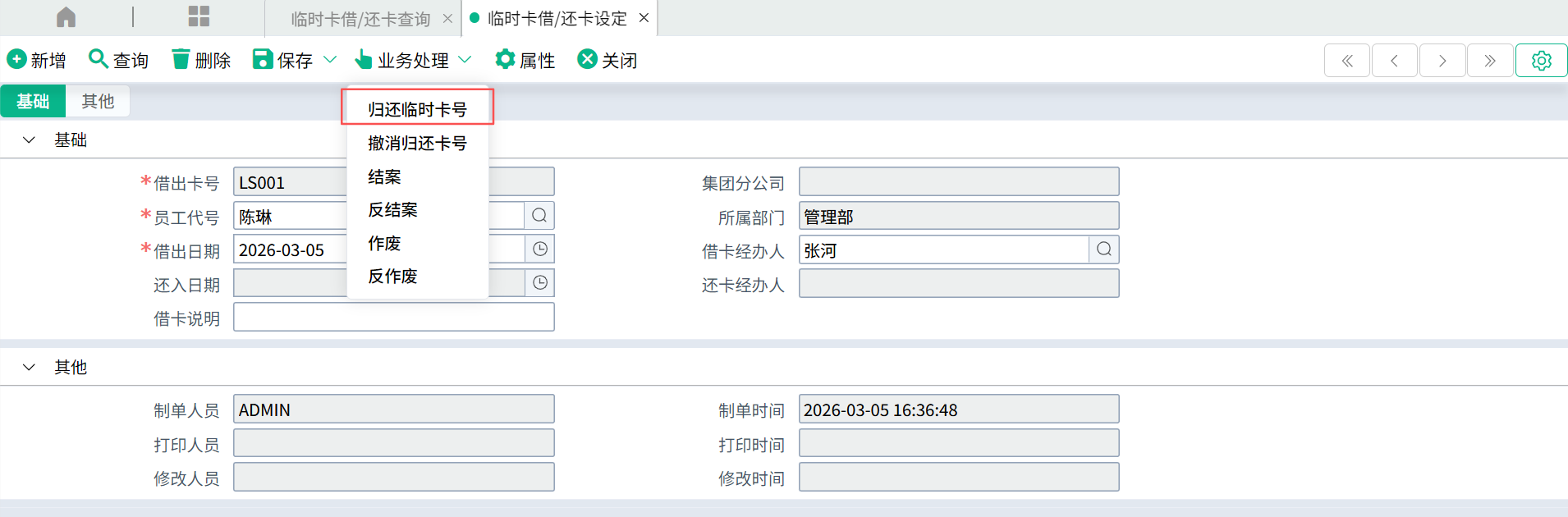 | 还卡日期 | 归还临时卡号时自动回写还卡日期和时间。 |