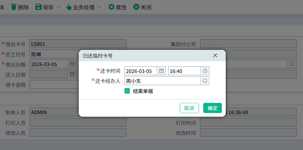(2)输入还卡时间、还卡经办人、勾选结案单据,点击【确定】