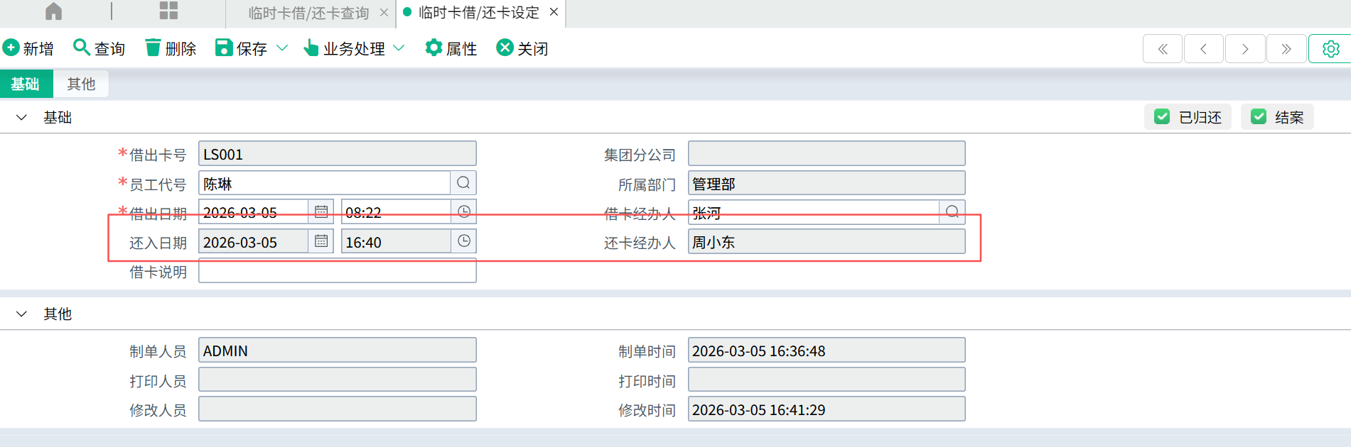 系统会将还入时间和还卡经办人回写到主画面:
