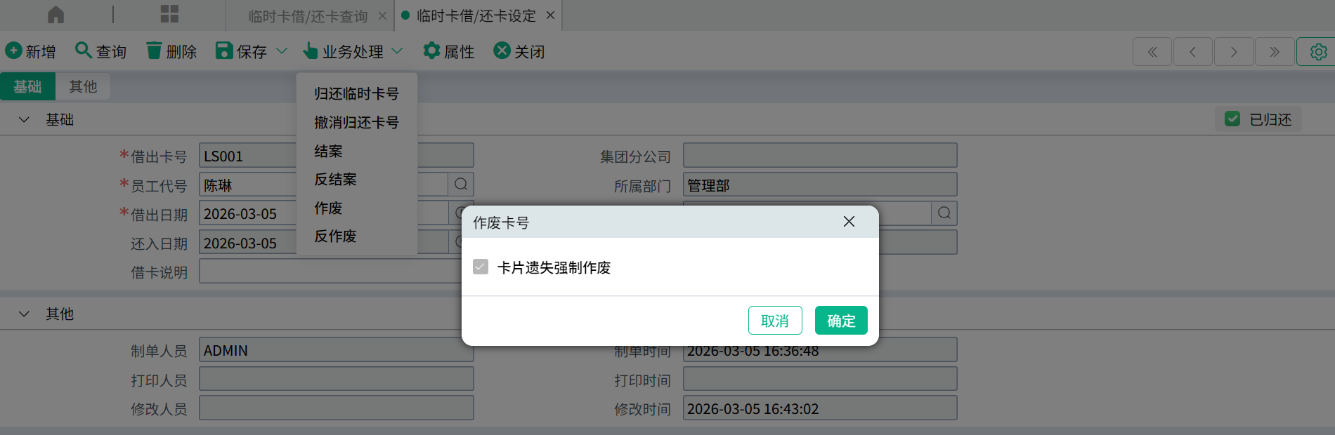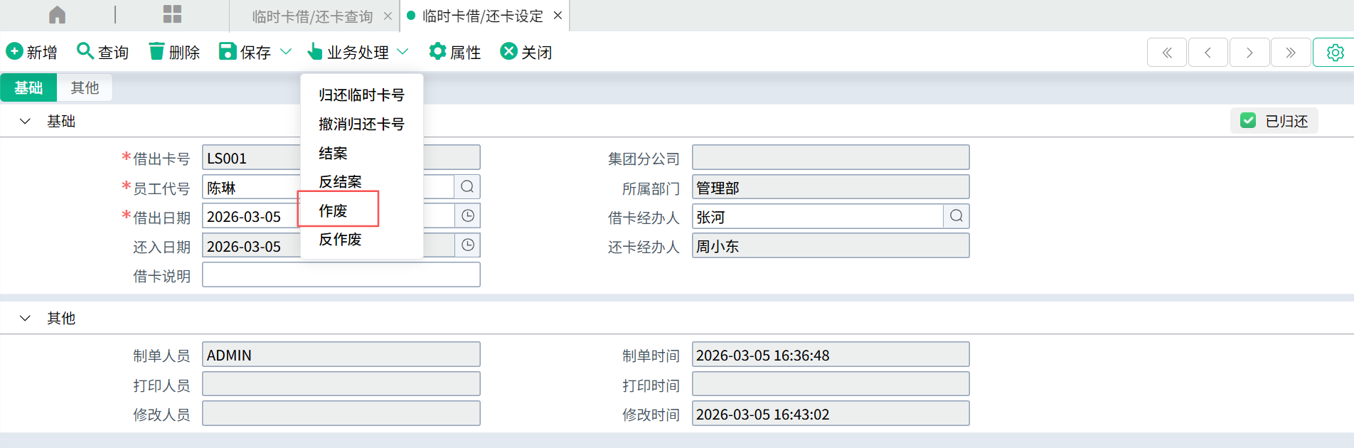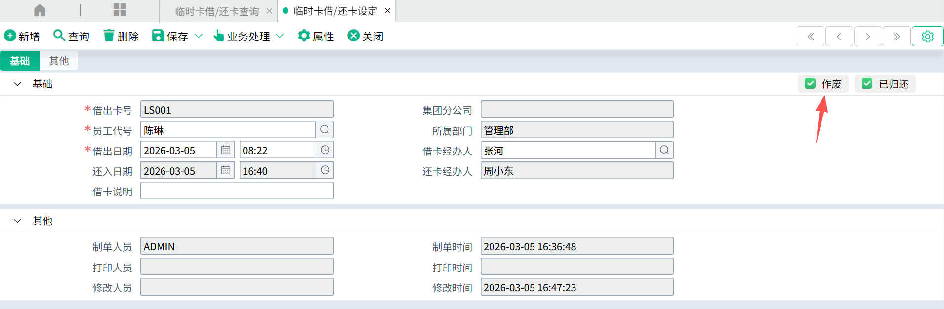 作废后的临时卡,会被标记“作废”。
