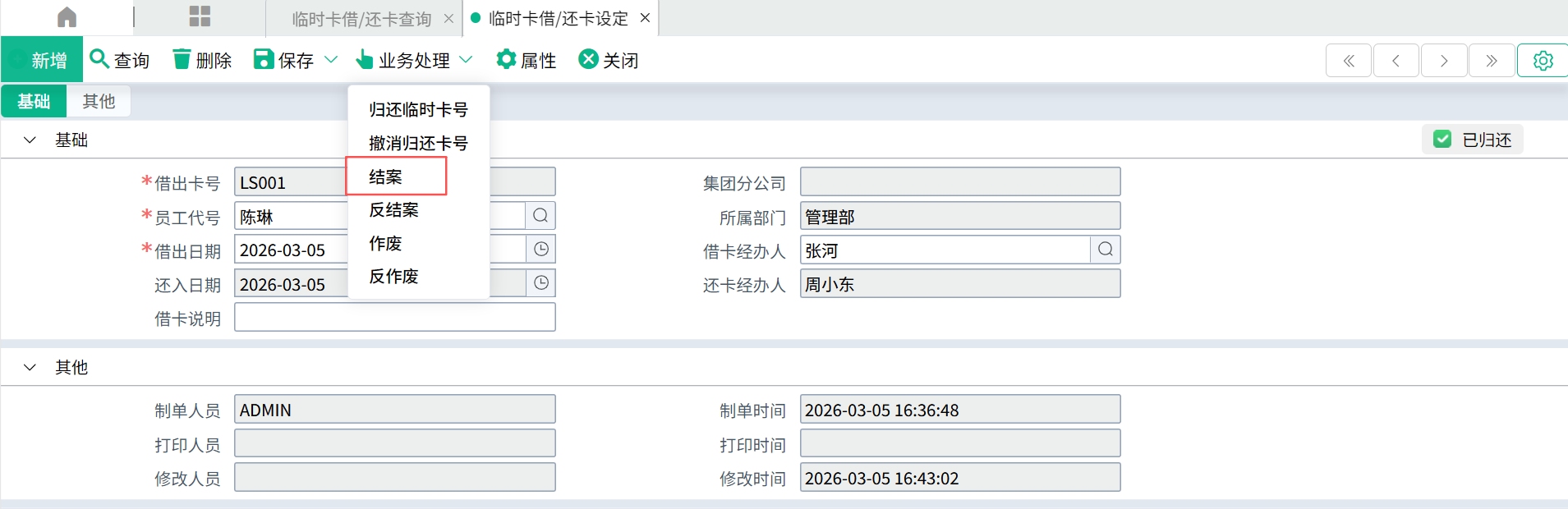 如果归还临时卡时有勾选“结案单据”,则不需要再结案;否则需要结案后,该临时卡才能再次被借出