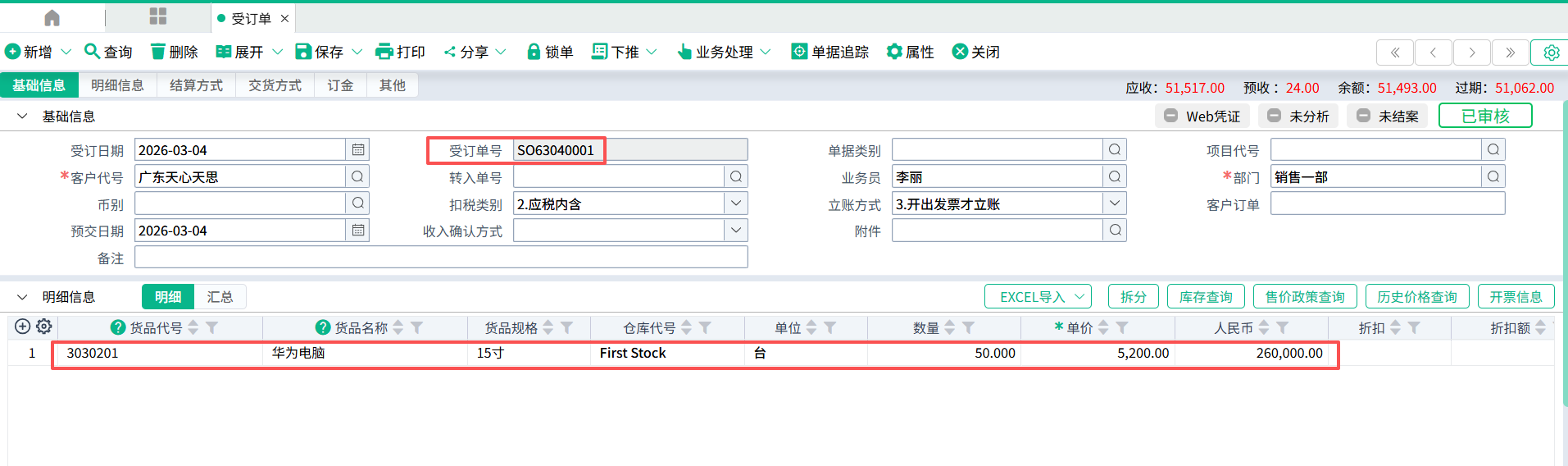 (1)登打受订单数据,保存。