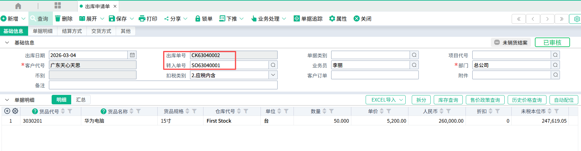 (2)受订单转出库申请单,保存。