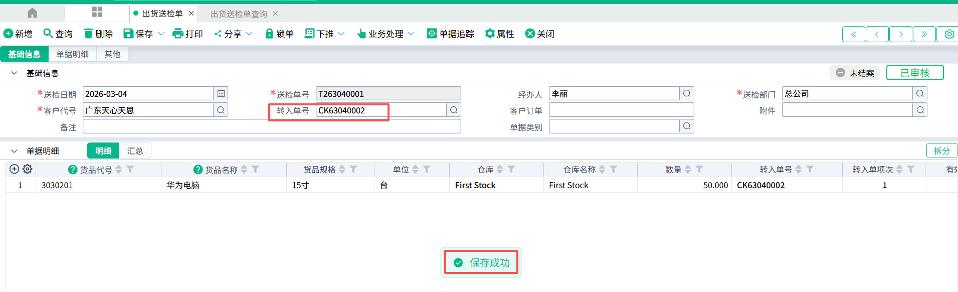 (3)打开出货送检单 ,点击表头的转入单号,过滤出该出库申请单,确定,带出数据到表身。 检测数据正确性,点击保存,保存成功即出货送检单登打完毕。