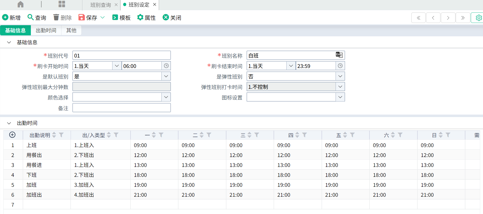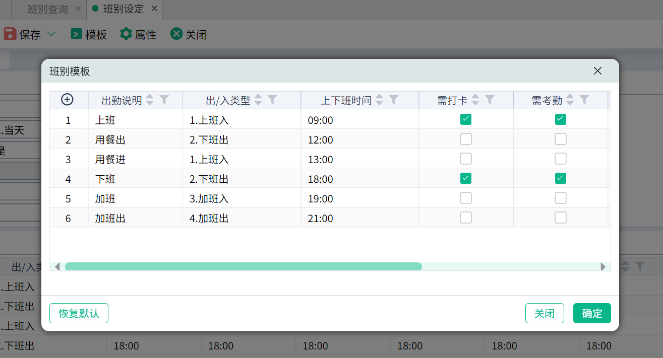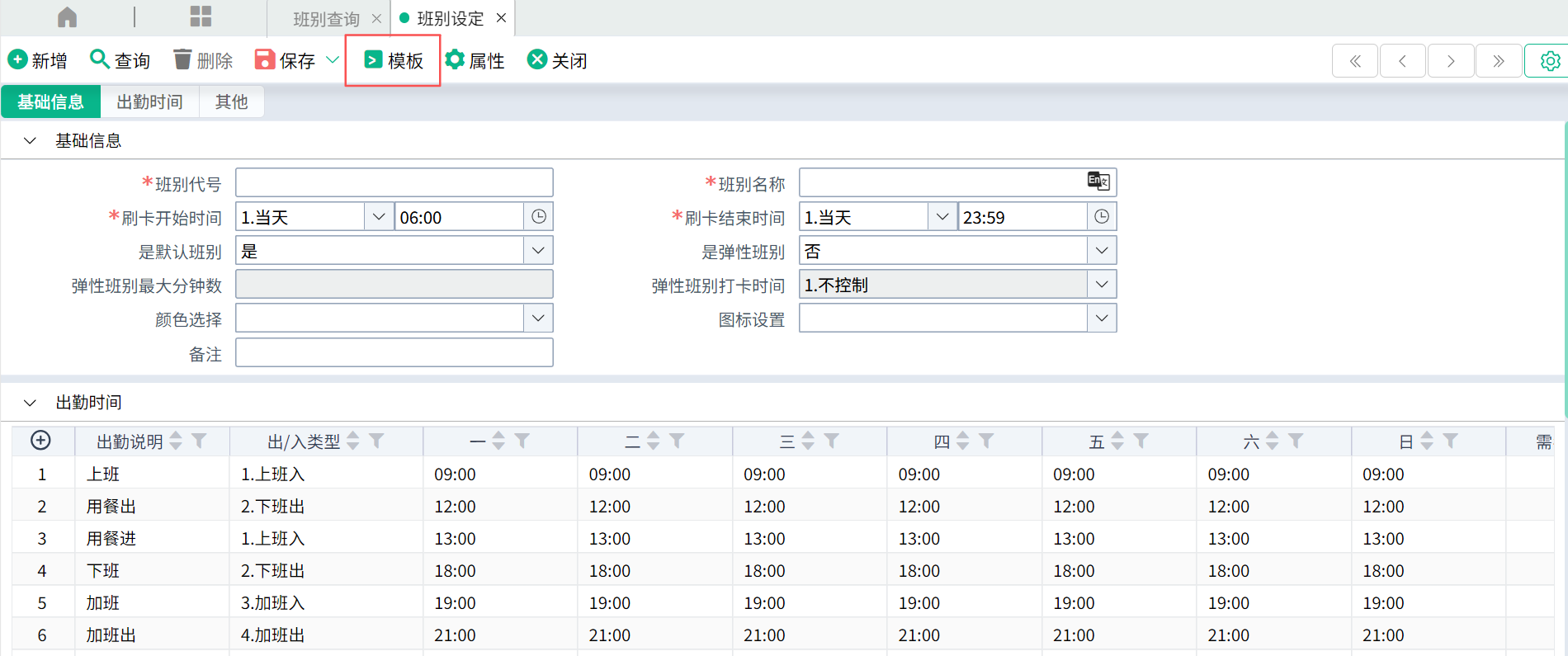 系统有提供班别出勤时间的默认模板,如果公司实际出勤时间与模板提供的不一致,可修改模板的内容。