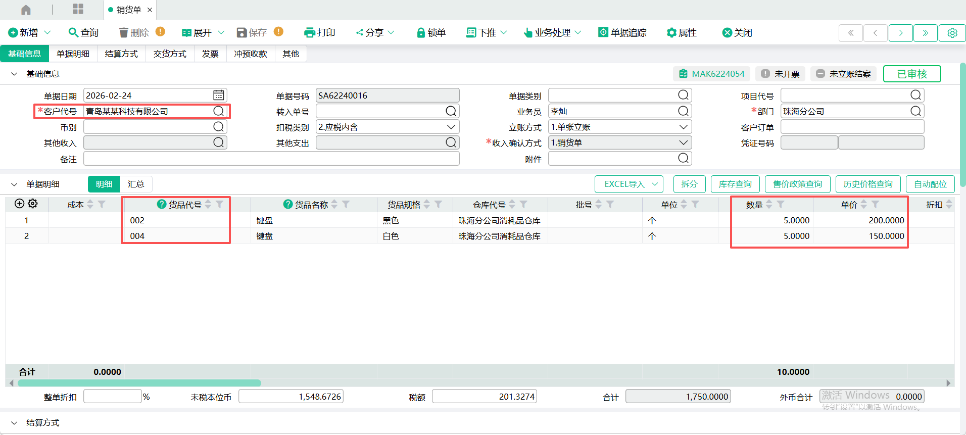 (1)新增一张【销货单】