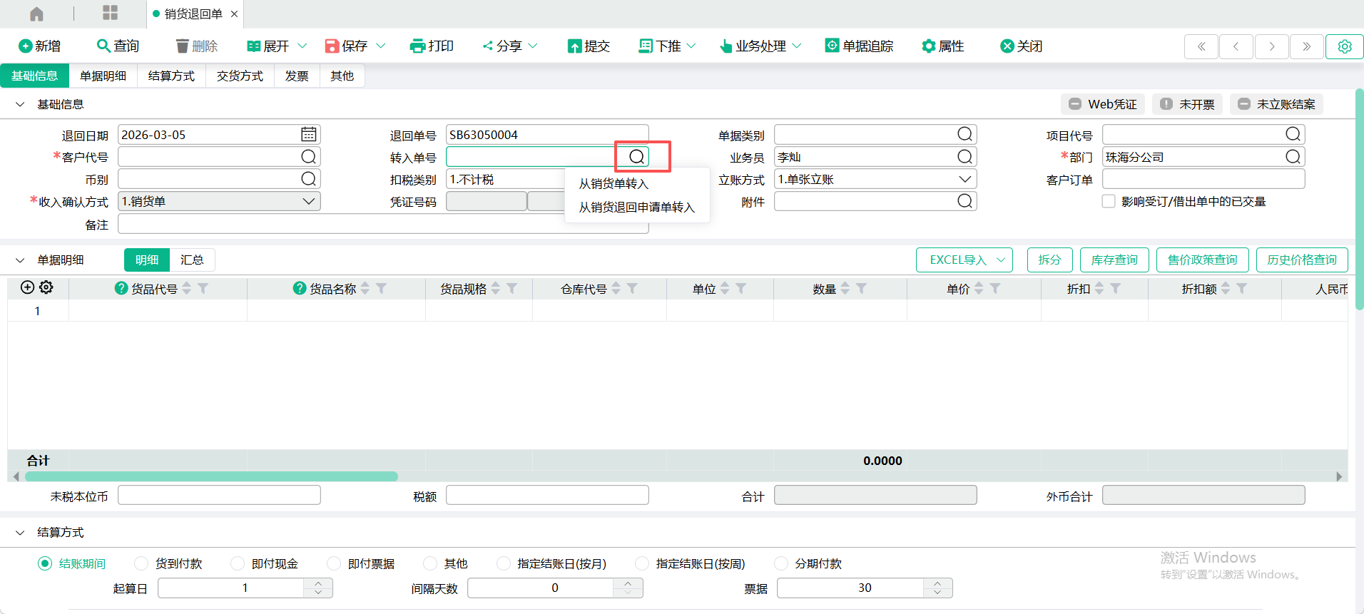 2、转入 【销货退回申请单】