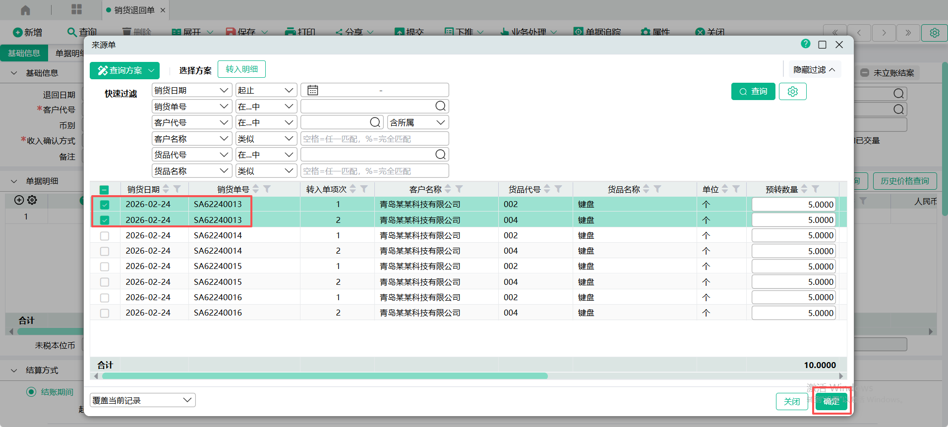 (2)进入【销货退回单】页面,点入表头【转入单号】查询窗口,输入过滤条件,查询出销货单,勾选要转入的单据记录,点【确定】 ;
