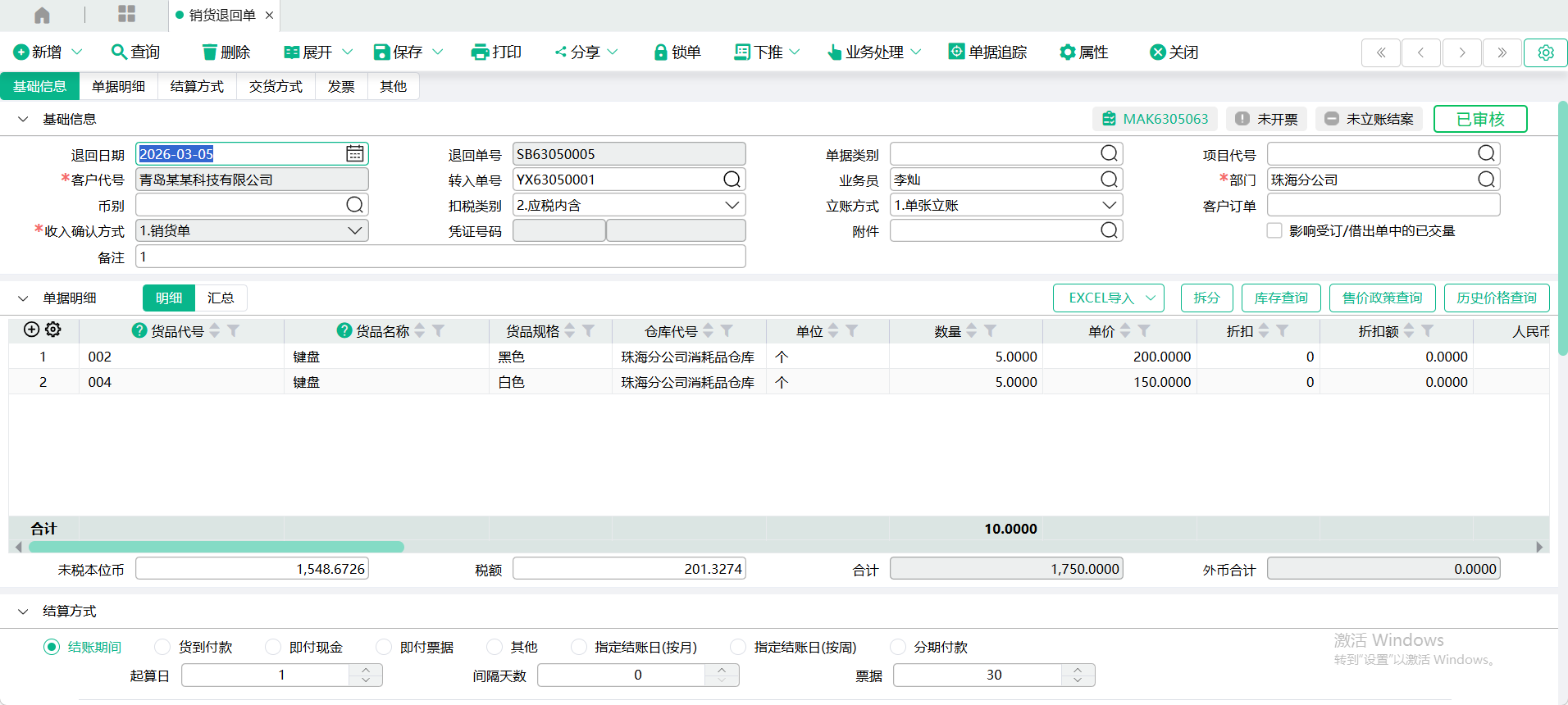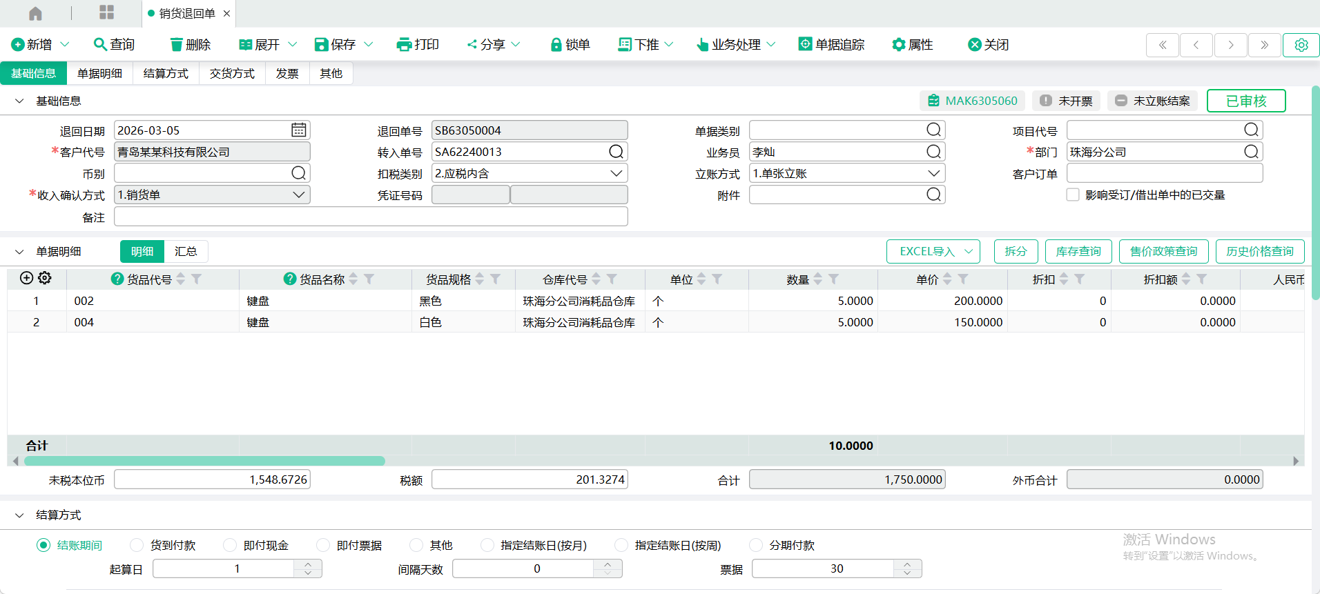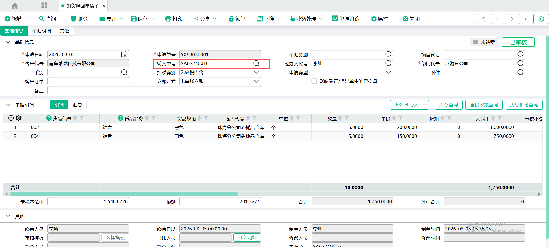 (3)、来源单回写:从销货单转入时,回写销货单的【未审核销货退回量 ;从销货退回申请单转入时,回写销货退回申请单的【未审核已转单量】。