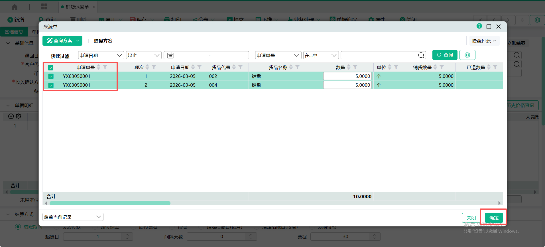 (2)、进入【销货退回单】页面,点入表头【转入单号】查询窗口,输入过滤条件,查询出销货退回申请单,勾选要转入的单据记录,点【确定】 ;